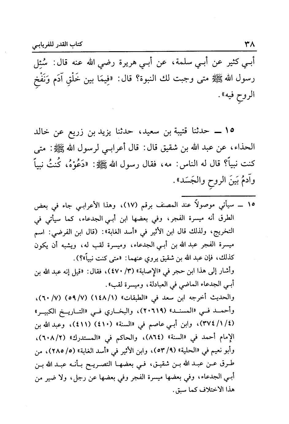 ١٥- سيأتي موصولاً عند المصنف برقم ١٧، وهذا الأعرابي جاء في بعض الطرق أنه ميسرة الفجر، وفي بعضها ابن أبي الجدعاء، كما سيأتي في التخريج، ولذلك قال ابن الأثير في أسد الغابة: قال ابن الفرضي: اسم ميسرة الفجر عبد الله بن أبي الجدعاء، وميسرة لقب له، ويشبه أن يكون كذلك، فإن عبد الله بن شقيق يروى عنهما: "متى كنت نبياً؟ ".
