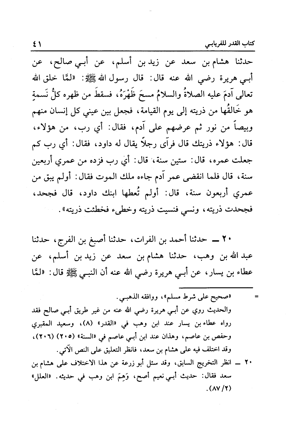 حَدَّثَنَا هِشَامُ بْنُ سَعْدٍ، عَنْ زَيْدِ بْنِ أَسْلَمَ، عَنْ أَبِي صَالِحٍ، عَنْ أَبِي هُرَيْرَةَ رَضِيَ اللَّهُ عَنْهُ، قَالَ: قَالَ رَسُولُ اللَّهِ صَلَّى اللهُ عَلَيْهِ وَسَلَّمَ: "لَمَّا خَلَقَ اللَّهُ تَعَالَى آدَمَ عَلَيْهِ الصَّلَاةُ وَالسَّلَامُ مَسَحَ ظَهْرَهَ، فَسَقَطَ مِنْ ظَهْرِهِ كُلُّ نَسَمَةٍ هُوَ خَالِقُهَا مِنْ ذُرِّيَّتِهِ إِلَى يَوْمِ الْقِيَامَةِ، فَجَعَلَ بَيْنَ عَيْنَيْ كُلِّ إِنْسَانٍ مِنْهُمْ وَبِيصًا مِنْ نُورٍ ثُمَّ عَرَضَهُمْ عَلَى آدَمَ، فَقَالَ: أَيْ رَبِّ، مَنْ هَؤُلَاءِ؟ , قَالَ: هَؤُلَاءِ ذُرِّيَّتُكَ، قَالَ: فَرَأَى رَجُلًا يُقَالَ لَهُ دَاوُدُ، فَقَالَ: أَيْ رَبِّ، كَمْ جَعَلْتَ عُمُرَهُ؟، قَالَ: سِتِّينَ سَنَةً، قَالَ: أَيْ رَبِّ فَزِدْهُ مِنْ عُمُرِي أَرْبَعِينَ سَنَةً، قَالَ فَلَمَّا انْقَضَى عُمُرُ آدَمَ جَاءَهُ مَلَكُ الْمَوْتِ، فَقَالَ: أَوَلَمْ يَبْقَ مِنْ عُمُرِي أَرْبَعُونَ سنة، قال: أو لم تُعْطِهَا ابْنَكَ دَاوُدَ، قَالَ فَجَحَدَ، فَجَحَدَتْ ذُرِّيَّتُهُ، وَنَسِيَ، فَنَسِيَتْ ذُرِّيَّتُهُ وَخَطِئَ، فَخَطِئَتْ ذُرِّيَّتُهُ".