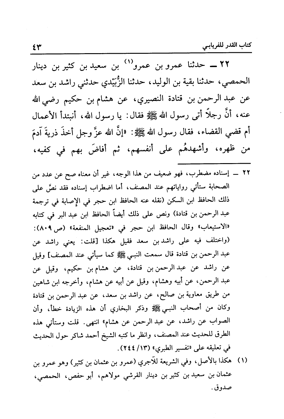 ٢٢ حَدَّثَنَا عَمْرُو بْنُ عَمْرِو١ بْنِ سَعِيدِ بْنِ كَثِيرِ بْنِ دِينَارٍ الْحِمْصِيُّ، حَدَّثَنَا بَقِيَّةُ بْنُ الْوَلِيدِ، حَدَّثَنَا الزُّبَيْدِيُّ, حَدَّثَنِي رَاشِدُ بْنُ سَعْدٍ, عَنْ عَبْدِ الرَّحْمَنِ بْنِ قَتَادَةَ النُّصَيْرِيِّ، عَنْ هِشَامِ بْنِ حَكِيمٍ رَضِيَ اللَّهُ عَنْهُ، أَنَّ رَجُلًا أَتَى رَسُولَ اللَّهِ صَلَّى اللهُ عَلَيْهِ وَسَلَّمَ, فَقَالَ: يَا رَسُولَ اللَّهِ، أَنَبْتَدِأُ الْأَعْمَالَ أَمْ قُضِيَ الْقَضَاءُ؟، فَقَالَ رَسُولُ اللَّهِ صَلَّى اللهُ عَلَيْهِ وَسَلَّمَ: "إِنَّ اللَّهَ عَزَّ وَجَلَّ أَخَذَ ذُرِّيَّةَ آدَمَ مِنْ ظَهْرِهِ، وَأَشْهَدَهُمْ عَلَى أنفسهم، ثم أفاض بهم في كفيه،