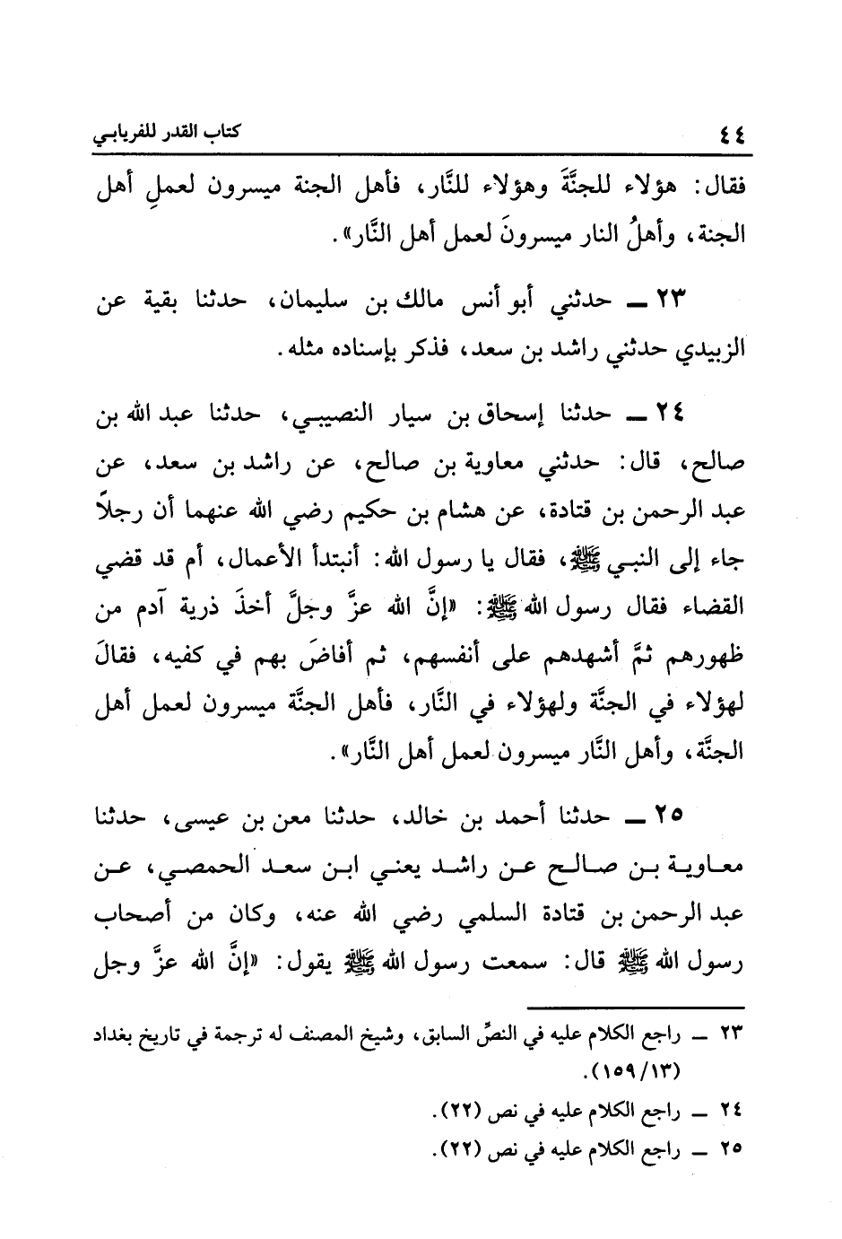 ٢٤ حَدَّثَنَا إِسْحَاقُ بْنُ سَيَّارٍ النَّصِيبِيُّ، حَدَّثَنَا عَبْدُ اللَّهِ بْنُ صَالِحٍ، قَالَ: حَدَّثَنِي مُعَاوِيَةُ بْنُ صَالِحٍ، عَنْ رَاشِدِ بْنِ سَعْدٍ، عَنْ عَبْدِ الرَّحْمَنِ بْنِ قَتَادَةَ، عَنْ هِشَامِ بْنِ حَكِيمٍ رَضِيَ اللَّهُ عَنْهُمَا, أَنَّ رَجُلًا جَاءَ إِلَى النَّبِيِّ صَلَّى اللهُ عَلَيْهِ وَسَلَّمَ، فَقَالَ: يَا رَسُولَ الله: أنبتدأ الأعمال، أم قد قضي القضا؟ , فَقَالَ رَسُولُ اللَّهِ صَلَّى اللهُ عَلَيْهِ وَسَلَّمَ: "إِنَّ اللَّهَ عَزَّ وَجَلَّ أَخَذَ ذُرِّيَّةَ آدَمَ مِنْ ظُهُورِهِمْ, ثُمَّ أَشْهَدَهُمْ عَلَى أَنْفُسِهِمْ، ثُمَّ أَفَاضَ بِهِمْ فِي كَفَّيْهِ، فَقَالَ لِهَؤُلَاءِ: فِي الْجَنَّةِ وَلِهَؤُلَاءِ: فِي النَّارِ، فَأَهْلُ الْجَنَّةِ مُيَسَّرُونَ لِعَمَلِ أَهْلِ الْجَنَّةِ، وَأَهْلُ النَّارِ مُيَسَّرُونَ لِعَمَلِ أَهْلِ النَّارِ".