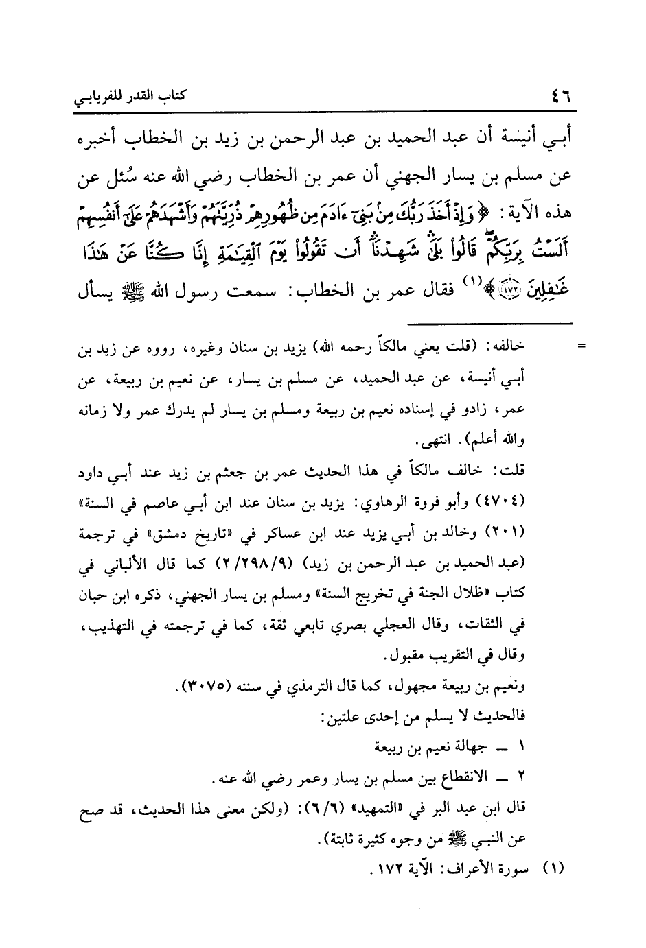 أَبِي أُنَيْسَةَ, أَنَّ عَبْدَ الْحَمِيدِ بْنَ عَبْدِ الرَّحْمَنِ بْنِ زَيْدِ بْنِ الْخَطَّابِ أَخْبَرَهُ, عَنْ مُسْلِمِ بْنِ يَسَارٍ الْجُهَنِيِّ, أَنَّ عُمَرَ بْنَ الْخَطَّابِ رَضِيَ اللَّهُ عَنْهُ سُئِلَ عَنْ هَذِهِ الْآيَةِ: {وَإِذْ أَخَذَ رَبُّكَ مِنْ بَنِي آدَمَ مِنْ ظُهُورِهِمْ ذُرِّيَّتَهُمْ وَأَشْهَدَهُمْ عَلَى أَنفُسِهِمْ أَلَسْتُ بِرَبِّكُمْ قَالُوا بَلَى شَهِدْنَا أَنْ تَقُولُوا يَوْمَ الْقِيَامَةِ إِنَّا كُنَّا عَنْ هَذَا غَافِلِينَ} ١, فَقَالَ عُمَرُ بْنُ الْخَطَّابِ: سَمِعْتُ رَسُولَ اللَّهِ صلى الله عليه وسلم يُسأل