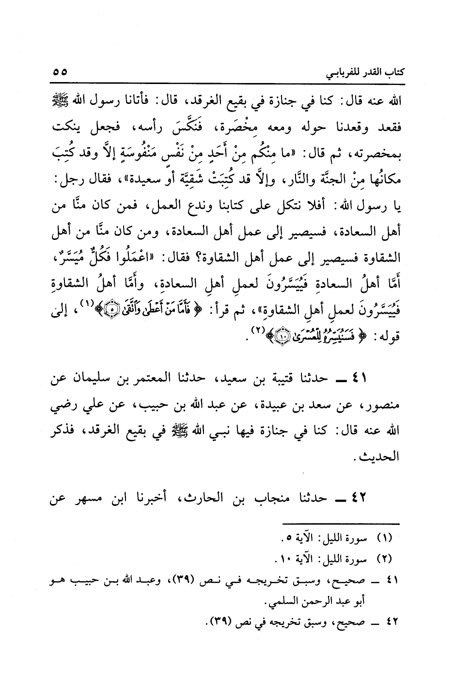 ٤١ حَدَّثَنَا قُتَيْبَةُ بْنُ سَعِيدٍ، حَدَّثَنَا الْمُعْتَمِرُ بْنُ سُلَيْمَانَ, عَنْ مَنْصُورٍ، عَنْ سَعْدِ بْنِ عُبَيْدَةَ، عند عَبْدِ اللَّهِ بْنِ حَبِيبٍ، عَنْ عَلِيٍّ رَضِيَ الله عنه, قال: كنا في جنارة فِيهَا نَبِيُّ اللَّهِ صَلَّى اللهُ عَلَيْهِ وَسَلَّمَ فِي بَقِيعِ الْغَرْقَدِ، فَذَكَرَ الْحَدِيثَ.