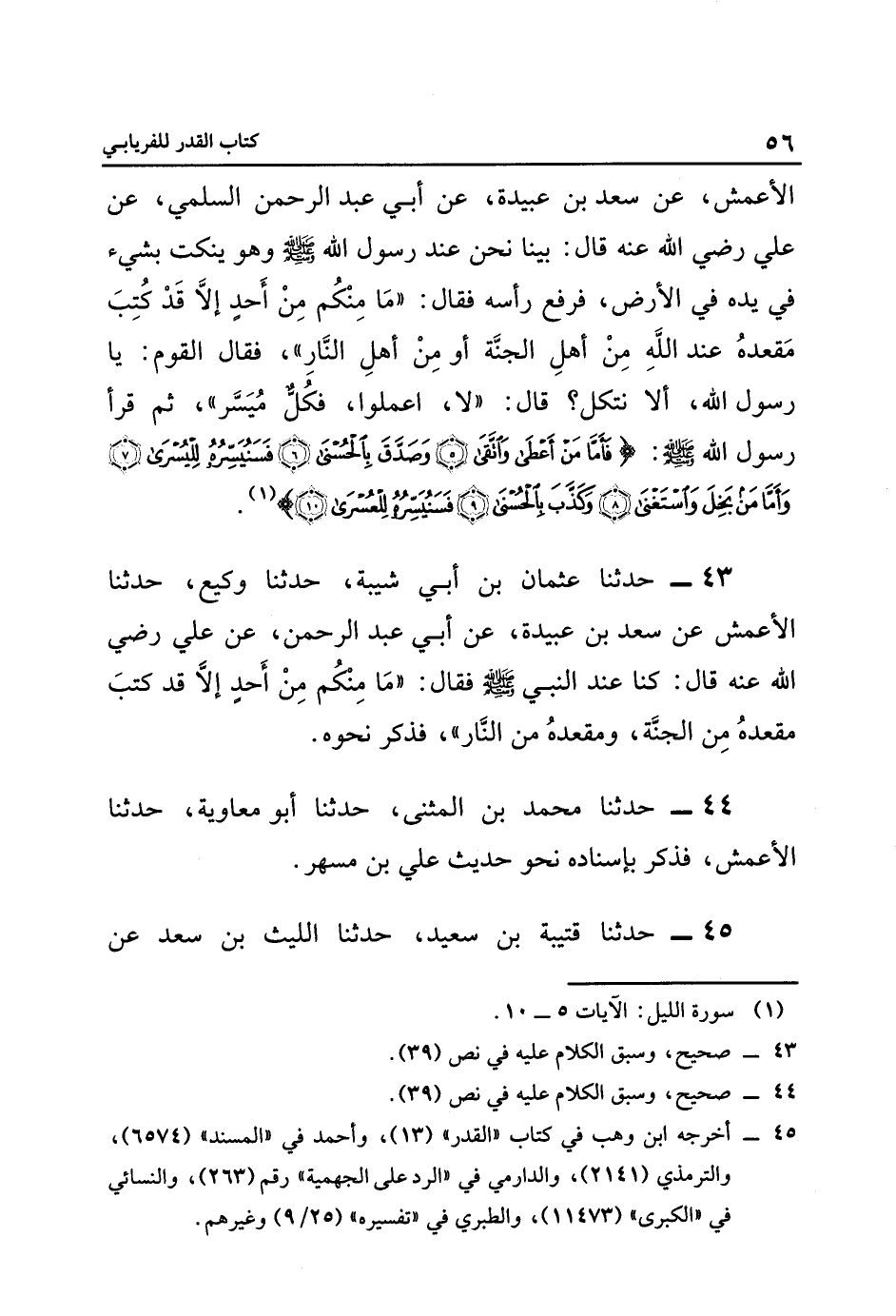 الأعمش، عن سعد بن عبيدة، عن أبي عَبْدِ الرَّحْمَنِ السُّلَمِيِّ، عَنْ عَلِيٍّ رَضِيَ اللَّهُ عَنْهُ, قَالَ: بَيْنَا نَحْنُ عِنْدَ رَسُولِ اللَّهِ صَلَّى اللهُ عَلَيْهِ وَسَلَّمَ, وَهُوَ يَنْكُتُ بِشَيْءٍ فِي يَدِهِ فِي الْأَرْضِ، فَرَفَعَ رَأْسَهُ, فَقَالَ: "مَا مِنْكُمْ مِنْ أَحَدٍ, إِلَّا قَدْ كُتِبَ مَقْعَدُهُ عِنْدَ اللَّهِ مِنْ أَهْلِ الْجَنَّةِ, أَوْ مِنْ أَهْلِ النَّارِ"، فَقَالَ الْقَوْمُ: يَا رَسُولَ اللَّهِ، أَلَا نَتَّكِلُ؟ قَالَ: "لَا، اعْمَلُوا، فَكُلٌّ مُيَسَّرٌ"، ثُمَّ قَرَأَ رَسُولُ اللَّهِ صَلَّى اللهُ عَلَيْهِ وَسَلَّمَ: {فَأَمَّا مَنْ أَعْطَى وَاتَّقَى وَصَدَّقَ بِالْحُسْنَى فَسَنُيَسِّرُهُ لِلْيُسْرَى وَأَمَّا مَنْ بَخِلَ وَاسْتَغْنَى وَكَذَّبَ بِالْحُسْنَى فَسَنُيَسِّرُهُ لِلْعُسْرَى} ١.