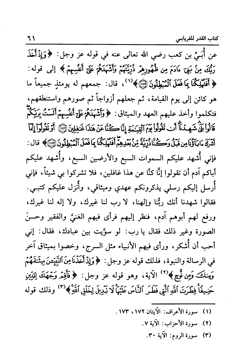 عَنْ أُبَيِّ بْنِ كَعْبٍ رَضِيَ اللَّهُ تَعَالَى عَنْهُ, فِي قَوْلِهِ عَزَّ وَجَلَّ: {وَإِذْ أَخَذَ رَبُّكَ مِنْ بَنِي آدَمَ مِنْ ظُهُورِهِمْ ذُرِّيَّتَهُمْ وَأَشْهَدَهُمْ عَلَى أَنفُسِهِمْ أَلَسْتُ بِرَبِّكُمْ قَالُوا بَلَى شَهِدْنَا أَنْ تَقُولُوا يَوْمَ الْقِيَامَةِ إِنَّا كُنَّا عَنْ هَذَا غَافِلِينَ أَوْ تَقُولُوا إِنَّمَا أَشْرَكَ آبَاؤُنَا مِنْ قَبْلُ وَكُنَّا ذُرِّيَّةً مِنْ بَعْدِهِمْ أَفَتُهْلِكُنَا بِمَا فَعَلَ الْمُبْطِلُونَ} ١، قال: جمعهم له يؤمئذ جَمِيعًا مَا هُوَ كَائِنٌ إِلَى يَوْمِ الْقِيَامَةِ، ثُمَّ جَعَلَهُمْ أَزْوَاجًا, ثُمَّ صَوَّرَهُمْ وَاسْتَنْطَقَهُمْ، فَتَكَلَّمُوا, وَأَخَذَ عَلَيْهِمُ الْعَهْدَ وَالْمِيثَاقَ: {وَأَشْهَدَهُمْ عَلَى أَنفُسِهِمْ أَلَسْتُ بِرَبِّكُمْ قَالُوا بَلَى شَهِدْنَا أَنْ تَقُولُوا يَوْمَ الْقِيَامَةِ إِنَّا كُنَّا عَنْ هَذَا غَافِلِينَ أَوْ تَقُولُوا إِنَّمَا أَشْرَكَ آبَاؤُنَا مِنْ قَبْلُ وَكُنَّا ذُرِّيَّةً مِنْ بَعْدِهِمْ أَفَتُهْلِكُنَا بِمَا فَعَلَ الْمُبْطِلُونَ} , قَالَ: فَإِنِّي أُشْهِدُ عَلَيْكُمُ السَّمَوَاتِ السَّبْعَ وَالْأَرَضِيَنَ السَّبْعَ، وَأُشْهِدُ عَلَيْكُمْ أَبَاكُمْ آدَمَ, أَنْ تَقُولُوا: إِنَّا كُنَّا عَنْ هَذَا غَافِلِينَ، فَلَا تُشْرِكُوا بِي شَيْئًا، فَإِنِّي أُرْسِلُ إِلَيْكُمْ رُسُلِي يُذَكِّرُونَكُمْ عَهْدِي وَمِيثَاقِي، وَأُنْزِلُ عَلَيْكُمْ كُتُبِي، فَقَالُوا: شَهِدْنَا أنك ربنا وإلهنا، لا رب لنا غيرك، وَلَا إِلَهَ لَنَا غَيْرُكَ، وَرُفِعَ لَهُمْ أَبُوهُمْ آدَمُ، فَنَظَرَ إِلَيْهِمْ , فَرَأَى فِيهِمُ الْغَنِيَّ, وَالْفَقِيرَ, وَحَسَنَ الصُّورَةِ, وَغَيْرَ ذَلِكَ, فَقَالَ: يَا رَبِّ: لَوْ سَوَّيْتَ بَيْنَ عِبَادِكَ؟، فَقَالَ: إِنِّي أُحِبُّ أَنْ أُشْكَرَ، وَرَأَى فِيهِمُ الْأَنْبِيَاءَ مِثْلَ السُّرُجِ، وَخُصُّوا بِمِيثَاقٍ آخَرَ فِي الرِّسَالَةِ وَالنُّبُوَّةِ، فَذَلِكَ قَوْلُهُ عَزَّ وَجَلَّ: {وَإِذْ أَخَذْنَا مِنْ النَّبِيِّينَ مِيثَاقَهُمْ وَمِنْكَ وَمِنْ نُوحٍ} ٢ الْآيَةَ، وَهُوَ قَوْلُهُ عَزَّ وَجَلَّ: {فَأَقِمْ وَجْهَكَ لِلدِّينِ حَنِيفاً فِطْرَةَ اللَّهِ الَّتِي فَطَرَ النَّاسَ عَلَيْهَا لا تَبْدِيلَ لِخَلْقِ اللَّهِ} ٣ وذلك قوله