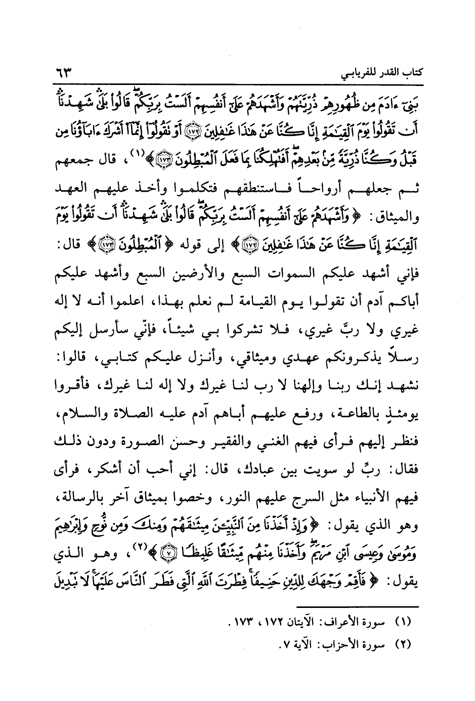 {وَأَشْهَدَهُمْ عَلَى أَنفُسِهِمْ أَلَسْتُ بِرَبِّكُمْ قَالُوا بَلَى شَهِدْنَا أَنْ تَقُولُوا يَوْمَ الْقِيَامَةِ إِنَّا كُنَّا عَنْ هَذَا غَافِلِينَ} إلى قوله: {الْمُبْطِلُونَ} , قَالَ: فَإِنِّي أُشْهِدُ عَلَيْكُمُ السَّمَوَاتِ السَّبْعَ, وَالْأَرَضِيَنَ السَّبْعَ, وَأُشْهِدُ عَلَيْكُمْ أَبَاكُمْ آدَمَ, أَنْ تَقُولُوا يوم القيامة: لم نعلم بهذا، اعملوا أَنَّهُ لَا إِلَهَ غَيْرِي وَلَا رَبِّ غَيْرِي، فَلَا تُشْرِكُوا بِي شَيْئًا، فَإِنِّي سَأُرْسِلُ إِلَيْكُمْ رُسُلًا يُذَكِّرُونَكُمْ عَهْدِي وَمِيثَاقِي، وَأُنْزِلُ عَلَيْكُمْ كِتَابِي، قَالُوا: نَشْهَدُ إِنَّكَ رَبُّنَا وَإِلَهُنَا, لَا رَبَّ لَنَا غَيْرُكَ, وَلَا إِلَهَ لَنَا غَيْرُكَ، فَأَقَرُّوا يَوْمَئِذٍ بِالطَّاعَةِ، وَرُفِعَ عَلَيْهِمْ أَبَاهُمْ آدَمُ عَلَيْهِ الصَّلَاةُ وَالسَّلَامُ، فَنَظَرَ إِلَيْهِمْ فَرَأَى فِيهِمُ الْغَنِيَّ, وَالْفَقِيرَ, وَحَسَنَ الصُّورَةِ, وَدُونَ ذَلِكَ فَقَالَ: رَبِّ لَوْ سَوَّيْتَ بَيْنَ عِبَادِكَ، قَالَ: إِنِّي أُحِبُّ أَنْ أُشْكَرَ، فَرَأَى فِيهِمُ الْأَنْبِيَاءَ مِثْلَ السُّرُجِ عَلَيْهِمُ النُّورُ، وَخُصُّوا بِمِيثَاقٍ آخَرَ بِالرِّسَالَةَ، وَهُوَ الَّذِي يَقُولُ: {وَإِذْ أَخَذْنَا مِنْ النَّبِيِّينَ مِيثَاقَهُمْ وَمِنْكَ وَمِنْ نُوحٍ وَإِبْرَاهِيمَ وَمُوسَى وَعِيسَى ابْنِ مَرْيَمَ وَأَخَذْنَا مِنْهُمْ مِيثَاقاً غَلِيظاً} ٢، وَهُوَ الَّذِي يَقُولُ: {فَأَقِمْ وَجْهَكَ لِلدِّينِ حَنِيفاً فِطْرَةَ اللَّهِ الَّتِي فَطَرَ النَّاسَ عَلَيْهَا لَا تَبْدِيلَ
