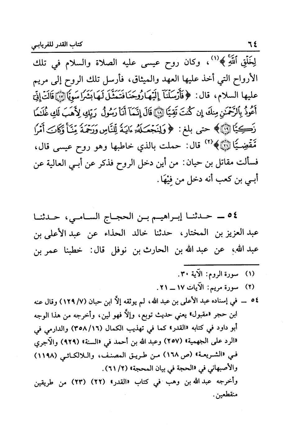 ٥٤- في إسناده عبد الأعلى بن عبد الله، لم يوثقه إلا ابن حبان: جـ ١٢٩/٧, وقال عنه ابن حجر: مقبول, يعني حديث توبع، وإلا فهو لين، وأخرجه من هذا الوجه أبو داود في كتابه: القدر, كما في تهذيب الكمال: جـ ٣٥٨/١٦, والدارمي في: الرد على الجهمية: ٢٥٧, وعبد الله بن أحمد في: السنة: ٩٢٩, والآجري في: الشريعة: صـ ١٦٨, من طريق المصنف، واللالكائي: ١١٩٨, والأصبهاني في: الحجة في بيان المحجة: جـ ٦١/٢.