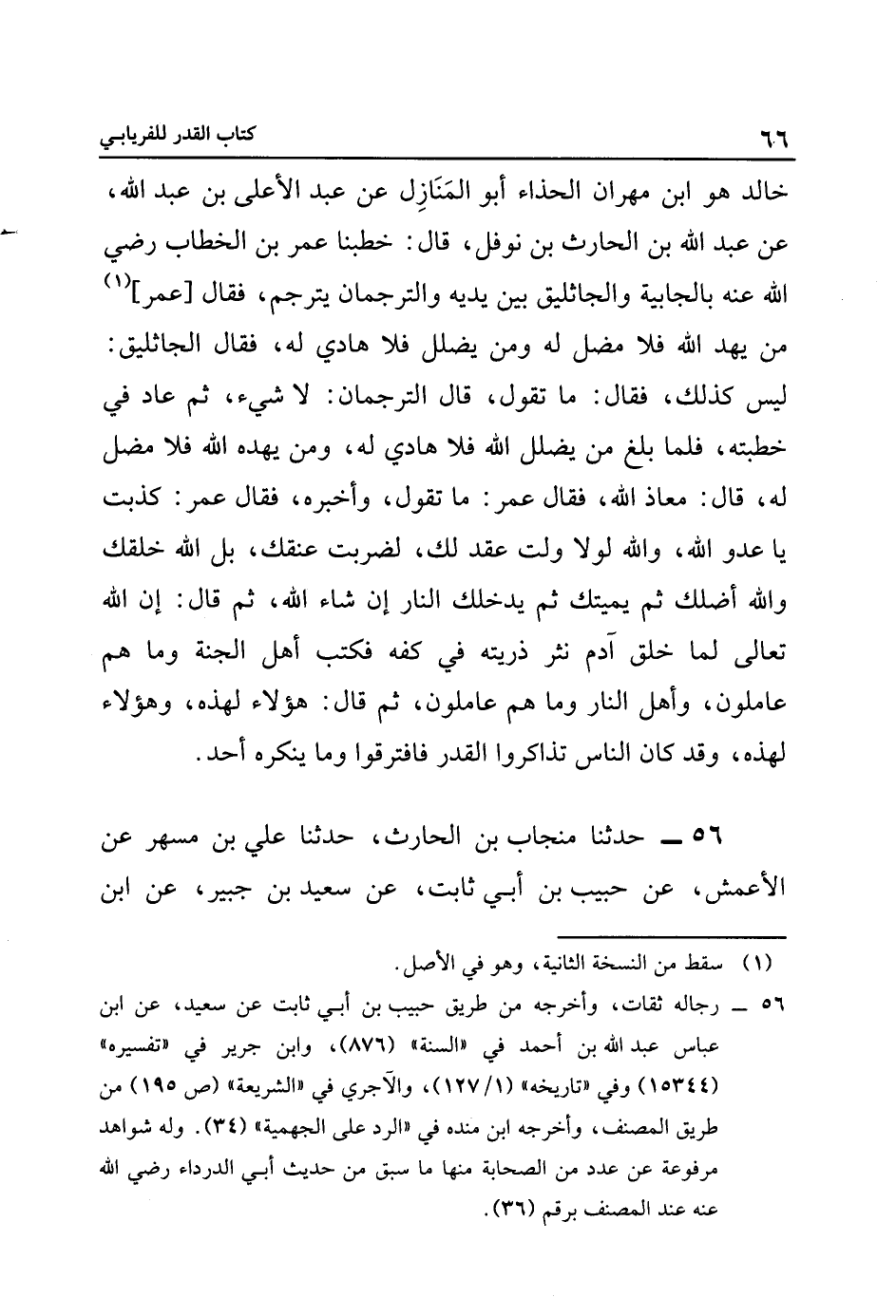 خَالِدٍ: هُوَ ابْنُ مِهْرَانَ الْحَذَّاءُ أَبُو الْمُنَازِلِ, عَنْ عَبْدِ الْأَعْلَى بْنِ عَبْدِ اللَّهِ، عَنْ عَبْدِ اللَّهِ بْنِ الْحَارِثِ بْنِ نَوْفَلٍ، قَالَ: خَطَبَنَا عُمَرُ بْنُ الْخَطَّابِ رَضِيَ اللَّهُ عَنْهُ بِالْجَابِيَةَ, وَالْجَاثَلِيقُ بَيْنَ يَدَيْهِ, وَالتُّرْجُمَانُ يُتَرْجِمُ، فَقَالَ عُمَرُ١: مَنْ يهدِ اللَّهُ فَلَا مُضِلَّ لَهُ, وَمَنْ يُضْلِلْ فَلَا هَادِيَ لَهُ، فَقَالَ الْجَاثَلِيقُ: لَيْسَ كَذَلِكَ، فَقَالَ: مَا تَقُولُ؟، قَالَ التُّرْجُمَانُ: لَا شَيْءَ، ثُمَّ عَادَ فِي خُطْبَتِهِ، فَلَمَّا بَلَغَ: مَنْ يُضْلِلِ اللَّهُ فَلَا هَادِيَ لَهُ، وَمَنْ يَهْدِهِ اللَّهُ فَلَا مُضِلَّ لَهُ، قَالَ: مَعَاذَ اللَّهِ، فَقَالَ عُمَرُ: مَا تَقُولُ؟، وَأَخْبَرَهُ، فَقَالَ عُمَرُ: كَذَبْتَ يَا عَدُوَّ اللَّهِ، وَاللَّهِ لَوْلَا وَلْتٌ عُقِدَ لَكَ، لَضَرَبْتُ عُنُقَكَ، بَلِ اللَّهُ خَلَقَكَ, وَاللَّهُ أَضَلَّكَ, ثُمَّ يُمِيتُكَ, ثُمَّ يدخلك النار إن شاء الله، ثم قال: إِنَّ اللَّهَ تَعَالَى لَمَّا خَلَقَ آدَمَ, نَثْرَ ذُرِّيَّتَهُ فِي كَفَّهِ, فَكَتَبَ أَهْلَ الْجَنَّةِ, وَمَا هُمْ عَامِلُونَ، وَأَهْلَ النَّارِ, وَمَا هُمْ عَامِلُونَ، ثُمَّ قَالَ: هَؤُلَاءِ لِهَذِهِ، وَهَؤُلَاءِ لِهَذِهِ، وَقَدْ كَانَ النَّاسُ تَذَاكَرُوا الْقَدَرَ, فَافْتَرَقُوا وَمَا يُنْكِرُهُ أَحَدٌ.