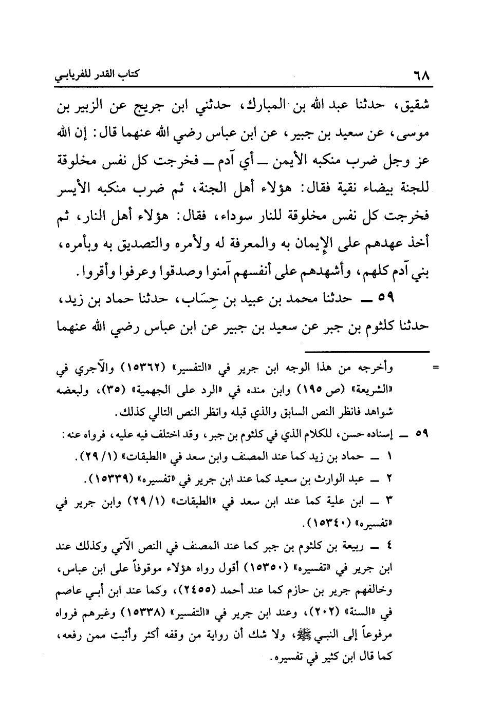شَقِيقٍ، حَدَّثَنَا عَبْدُ اللَّهِ بْنُ الْمُبَارَكِ، حَدَّثَنِي ابْنُ جُرَيْجٍ, عَنِ الزُّبَيْرِ بْنِ مُوسَى، عَنْ سَعِيدِ بْنِ جُبَيْرٍ، عَنِ ابْنِ عَبَّاسٍ رَضِيَ اللَّهُ عَنْهُمَا, قَالَ: إِنَّ اللَّهَ عَزَّ وَجَلَّ ضَرَبَ مَنْكِبَهُ الْأَيْمَنَ -أَيْ آدَمُ- فَخَرَجَتْ كُلُّ نَفْسٍ مَخْلُوقَةٍ لِلْجَنَّةِ بَيْضَاءَ نَقِيَّةً, فَقَالَ: هَؤُلَاءِ أَهْلُ الْجَنَّةِ، ثُمَّ ضَرَبَ مَنْكِبَهُ الْأَيْسَرَ فَخَرَجَتْ كُلُّ نَفْسٍ مَخْلُوقَةٍ لِلنَّارِ سَوْدَاءَ، فَقَالَ: هَؤُلَاءِ أَهْلُ النَّارِ، ثُمَّ أَخَذَ عَهْدَهُمْ عَلَى الْإِيمَانِ بِهِ, وَالْمَعْرِفَةِ لَهُ, وَلِأَمْرِهِ, وَالتَّصْدِيقِ بِهِ, وَبِأَمْرِهِ، بَنِي آدَمَ كُلِّهِمْ، وَأَشْهَدَهُمْ عَلَى أَنْفُسِهِمْ: آمَنُوا وَصَدَّقُوا وَعَرَفُوا وَأَقَرُّوا.