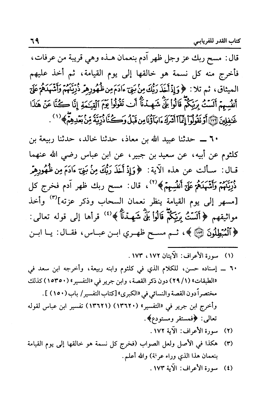 ٦٠ حَدَّثَنَا عُبَيْدُ اللَّهِ بْنُ مُعَاذٍ، حَدَّثَنَا خَالِدٌ، حَدَّثَنَا رَبِيعَةُ بْنُ كُلْثُومٍ, عَنْ أَبِيهِ، عَنْ سَعِيدِ بْنِ جُبَيْرٍ، عَنِ ابْنِ عَبَّاسٍ رَضِيَ اللَّهُ عَنْهُمَا, قَالَ: سَأَلْتُ عَنْ هَذِهِ الْآيَةِ: {وَإِذْ أَخَذَ رَبُّكَ مِنْ بَنِي آدَمَ مِنْ ظُهُورِهِمْ ذُرِّيَّتَهُمْ وَأَشْهَدَهُمْ عَلَى أَنفُسِهِمْ} ٢، قَالَ: مَسَحَ رَبُّكَ ظَهْرَ آدَمَ, فَخَرَّجَ كُلَّ [مسهر إلى يوم القيامة ينظر نعمان السحاب, وذكر عزته] ٣ وَأَخَذَ مَوَاثِيقَهُمْ {أَلَسْتُ بِرَبِّكُمْ قَالُوا بَلَى شَهِدْنَا} ٤ قرأها إلى قوله تعالى: {الْمُبْطِلُونَ} ، ثُمَّ مَسَحَ ظَهْرِيَ ابْنُ عَبَّاسٍ، فَقَالَ: يَا ابن