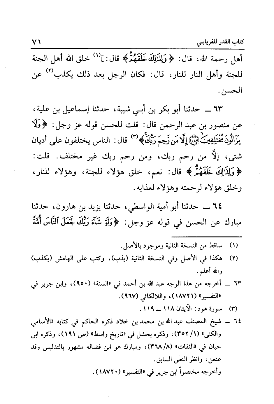 أهل رحمه الله، قال: {وَلِذَلِكَ خَلَقَهُمْ} قَالَ:] ١ خَلَقَ اللَّهُ أَهْلَ الْجَنَّةِ لِلْجَنَّةِ, وَأَهْلَ النَّارِ لِلنَّارِ، قَالَ: فَكَانَ الرَّجُلُ بَعْدَ ذَلِكَ يَكْذِبُ٢ عَنِ الْحَسَنِ.