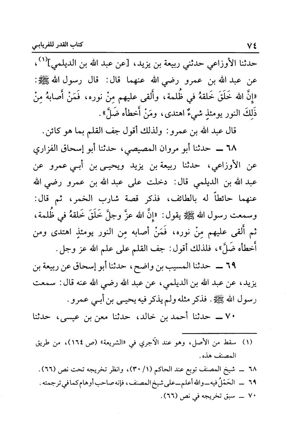 ٦٨ حَدَّثَنَا أَبُو مَرْوَانَ الْمِصِّيصِيُّ، حَدَّثَنَا أَبُو إِسْحَاقَ الْفَزَارِيُّ, عَنِ الْأَوْزَاعِيِّ، حَدَّثَنَا رَبِيعَةُ بْنُ يَزِيدَ, وَيَحْيَى بْنُ أَبِي عَمْرٍو, عَنْ عَبْدِ اللَّهِ بْنِ الدَّيْلَمِيِّ, قَالَ: دَخَلْتُ عَلَى عَبْدِ اللَّهِ بْنِ عَمْرٍو رَضِيَ اللَّهُ عَنْهُمَا حَائِطًا لَهُ بِالطَّائِفِ، فَذَكَرَ قِصَّةَ شَارِبِ الْخَمْرِ، ثُمَّ قَالَ: وَسَمِعْتُ رَسُولَ اللَّهِ صَلَّى اللهُ عَلَيْهِ وَسَلَّمَ يَقُولُ: "إِنَّ اللَّهَ عَزَّ وَجَلَّ خَلَقَ خَلْقَهُ فِي ظُلْمَةٍ، ثُمَّ أَلْقَى عَلَيْهِمْ مِنْ نُورِهِ، فَمَنْ أَصَابَهُ مِنَ النور يؤمئذ اهْتَدَى, وَمَنْ أَخْطَأَهُ ضَلَّ"،
