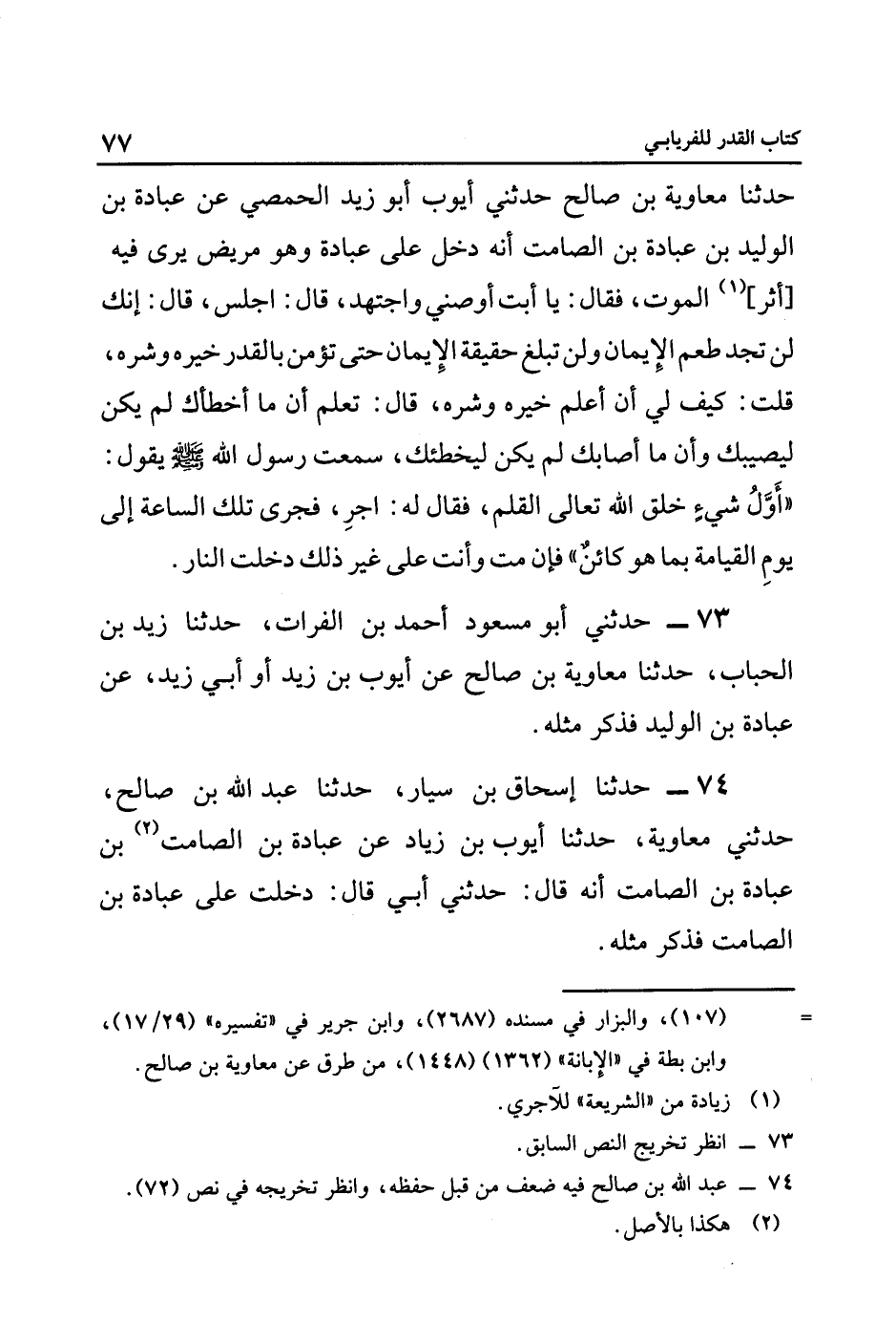 ٧٤ حَدَّثَنَا إِسْحَاقُ بْنُ سَيَّارٍ، حَدَّثَنَا عَبْدُ اللَّهِ بْنُ صَالِحٍ، حَدَّثَنِي مُعَاوِيَةُ، حَدَّثَنَا أَيُّوبُ بْنُ زِيَادٍ, عَنْ عُبَادَةَ بْنِ الصَّامِتِ٢بْنِ عُبَادَةَ بْنِ الصَّامِتِ, أَنَّهُ قَالَ: حَدَّثَنِي أَبِي, قَالَ: دَخَلْتُ عَلَى عبادة بن الصامت, فذكر مثله.