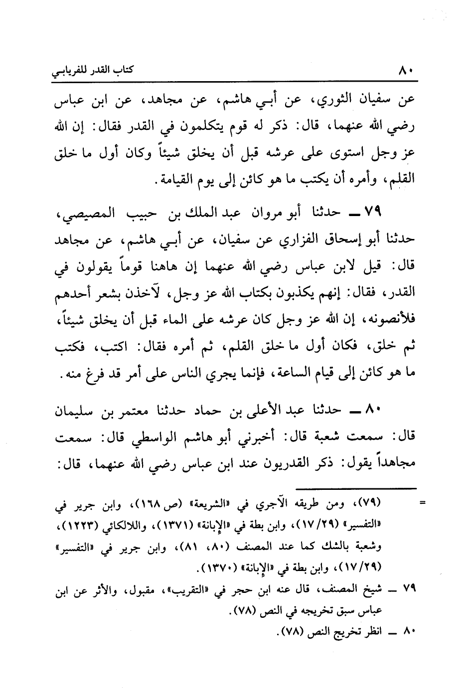 ٧٩ حَدَّثَنَا أَبُو مروان عبد الملك بن حبيب المصيصي، حدثنا أَبُو إِسْحَاقَ الْفَزَارِيُّ، عَنْ سُفْيَانَ، عَنْ أَبِي هَاشِمٍ، عَنْ مُجَاهِدٍ، قَالَ: قِيلَ لِابْنِ عَبَّاسٍ رَضِيَ اللَّهُ عَنْهُمَا: إِنَّ هَاهُنَا قَوْمًا يَقُولُونَ فِي الْقَدَرِ، فَقَالَ: إِنَّهُمْ يُكَذِّبُونَ بِكِتَابِ اللَّهِ عَزَّ وَجَلَّ، لَآخُذَنَّ بِشَعْرِ أَحَدِهِمْ فَلَأَنْصُوَنَّهُ، إِنَّ اللَّهَ عَزَّ وَجَلَّ كَانَ عَرْشُهُ عَلَى الْمَاءِ قَبْلَ أَنْ يَخْلُقَ شَيْئًا، ثُمَّ خَلَقَ، فَكَانَ أَوَّلَ مَا خَلَقَ الْقَلَمُ، ثُمَّ أَمَرَهُ فَقَالَ: اكْتُبْ، فَكَتَبَ مَا هُوَ كَائِنٌ إِلَى قِيَامِ السَّاعَةِ، فَإِنَّمَا يَجْرِي النَّاسُ عَلَى أَمْرٍ قَدْ فُرِغَ مِنْهُ.