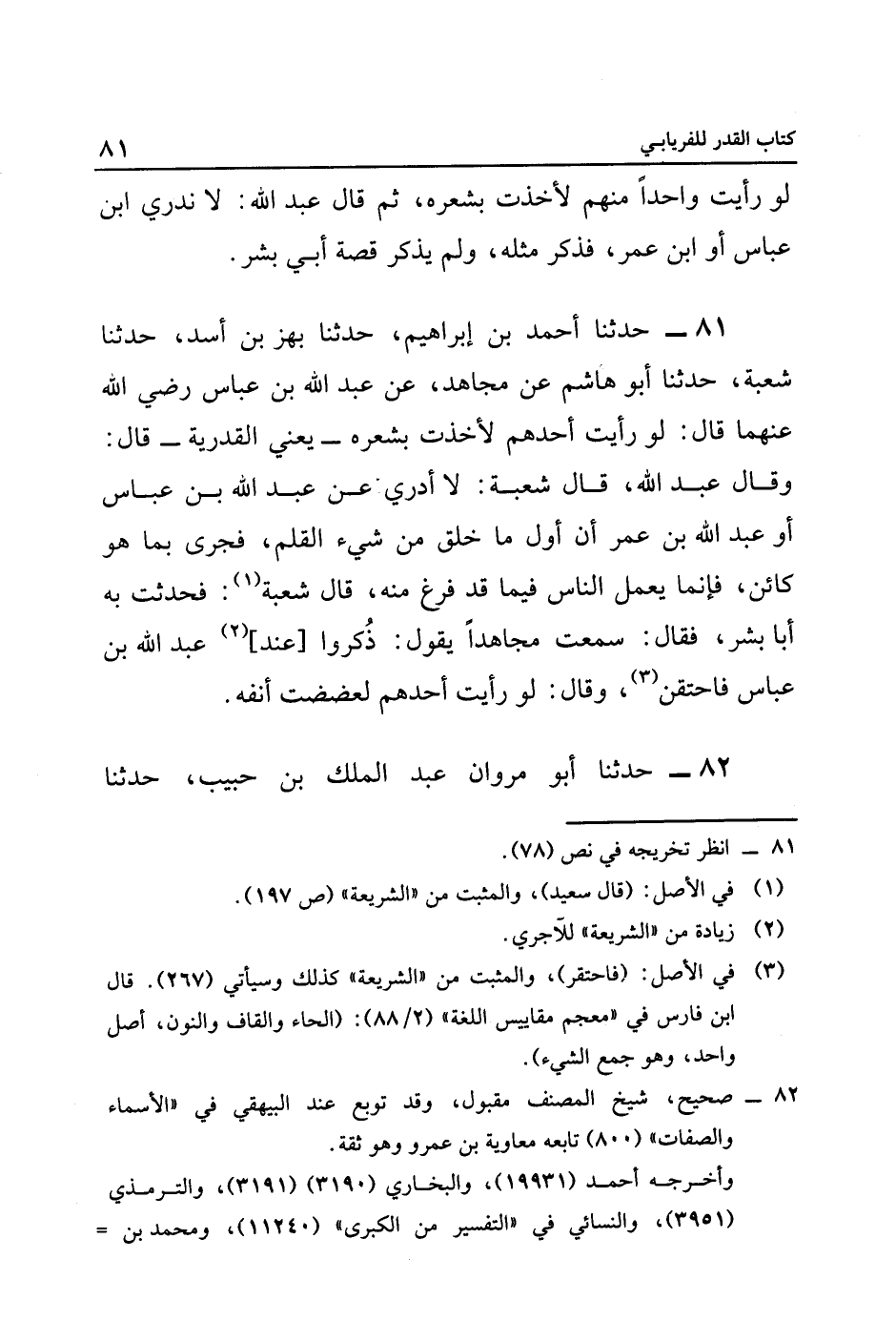 ٨١ حَدَّثَنَا أَحْمَدُ بْنُ إِبْرَاهِيمَ، حَدَّثَنَا بَهْزُ بْنُ أَسَدٍ، حَدَّثَنَا شُعْبَةُ، حَدَّثَنَا أَبُو هَاشِمٍ، عَنْ مُجَاهِدٍ، عَنْ عَبْدِ اللَّهِ بْنِ عَبَّاسٍ رَضِيَ اللَّهُ عَنْهُمَا، قَالَ: لَوْ رَأَيْتُ أَحَدَهُمْ لَأَخَذْتُ بِشَعَرِهِ -يَعْنِي الْقَدَرِيَّةَ- قَالَ: وَقَالَ عَبْدُ اللَّهِ، قَالَ شُعْبَةُ: لَا أَدْرِي عَنْ عَبْدِ اللَّهِ بْنِ عَبَّاسٍ، أَوْ عَبْدِ اللَّهِ بْنِ عُمَرَ أَنَّ أَوَّلَ مَا خُلِقَ مِنْ شَيْءٍ الْقَلَمُ، فَجَرَى بِمَا هُوَ كَائِنٌ، فَإِنَّمَا يَعْمَلُ النَّاسُ فِيمَا قَدْ فُرِغَ مِنْهُ، وقال شُعْبَةُ١: فَحَدَّثْتُ بِهِ أَبَا بِشْرٍ، فَقَالَ: سَمِعْتُ مُجَاهِدًا يَقُولُ: ذُكِرُوا [عِنْدَ] ٢ عَبْدِ اللَّهِ بْنِ عَبَّاسٍ فَاحْتَقَنَ٣، وَقَالَ: لَوْ رَأَيْتُ أَحَدَهُمْ لَعَضَضْتُ أَنْفَهُ.