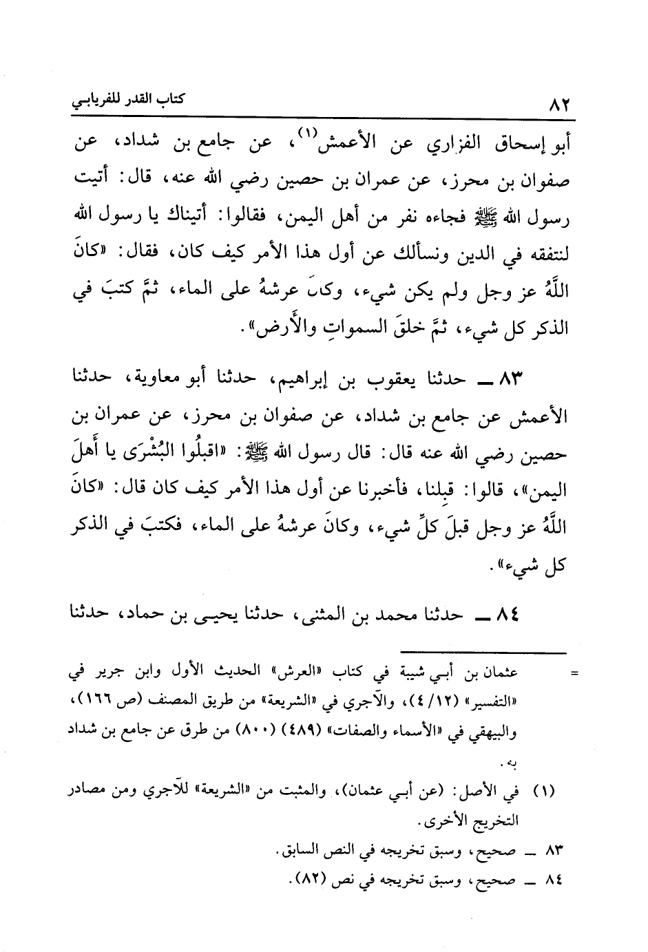 ٨٣ حَدَّثَنَا يَعْقُوبُ بْنُ إِبْرَاهِيمَ، حَدَّثَنَا أَبُو مُعَاوِيَةَ، حَدَّثَنَا الْأَعْمَشُ عَنْ جَامِعِ بْنِ شَدَّادٍ، عَنْ صَفْوَانَ بْنِ مُحْرِزٍ، عَنْ عِمْرَانَ بْنِ حُصَيْنٍ رَضِيَ اللَّهُ عَنْهُ، قَالَ: قَالَ رَسُولُ اللَّهِ صَلَّى اللهُ عَلَيْهِ وَسَلَّمَ: "اقْبَلْوا الْبُشْرَى يَا أَهْلَ الْيَمَنِ"، قَالُوا: قَبِلْنَا، فَأَخْبِرْنَا عَنْ أَوَّلِ هَذَا الْأَمْرِ كَيْفَ كَانَ، قَالَ: "كَانَ اللَّهُ عَزَّ وَجَلَّ قَبْلَ كُلِّ شَيْءٍ، وَكَانَ عَرْشُهُ عَلَى الْمَاءِ، فَكَتَبَ فِي الذِّكْرِ كُلَّ شَيْءٍ".