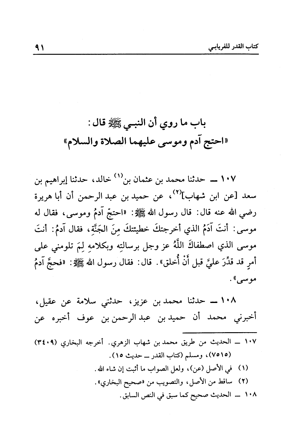 ١٠٧ حَدَّثَنَا مُحَمَّدُ بْنُ عُثْمَانَ بْنِ ١ خَالِدٍ، حَدَّثَنَا إِبْرَاهِيمُ بْنُ سَعْدٍ, [عَنِ ابْنِ شِهَابٍ] ٢، عَنْ حُمَيْدِ بْنِ عَبْدِ الرَّحْمَنِ, أَنَّ أَبَا هُرَيْرَةَ رَضِيَ اللَّهُ عَنْهُ قَالَ: قَالَ رَسُولُ اللَّهِ صَلَّى اللهُ عَلَيْهِ وَسَلَّمَ: "احْتَجَّ آدَمُ وَمُوسَى، فَقَالَ لَهُ مُوسَى: أَنْتَ آدَمُ الَّذِي أَخْرَجَتْكَ خَطِيئَتُكَ مِنَ الْجَنَّةِ، فَقَالَ آدَمُ: أَنْتَ مُوسَى الَّذِي اصْطَفَاكَ اللَّهُ عَزَّ وَجَلَّ بِرِسَالَتِهِ, وَبِكَلَامِهِ, لِمَ تَلُومُنِي عَلَى أَمْرٍ قَدْ قُدِّرَ عَلَيَّ قَبْلَ أَنْ أُخْلَقَ". قَالَ: فَقَالَ رَسُولُ اللَّهِ صَلَّى اللهُ عَلَيْهِ وَسَلَّمَ: "فَحَجَّ آدَمُ مُوسَى".