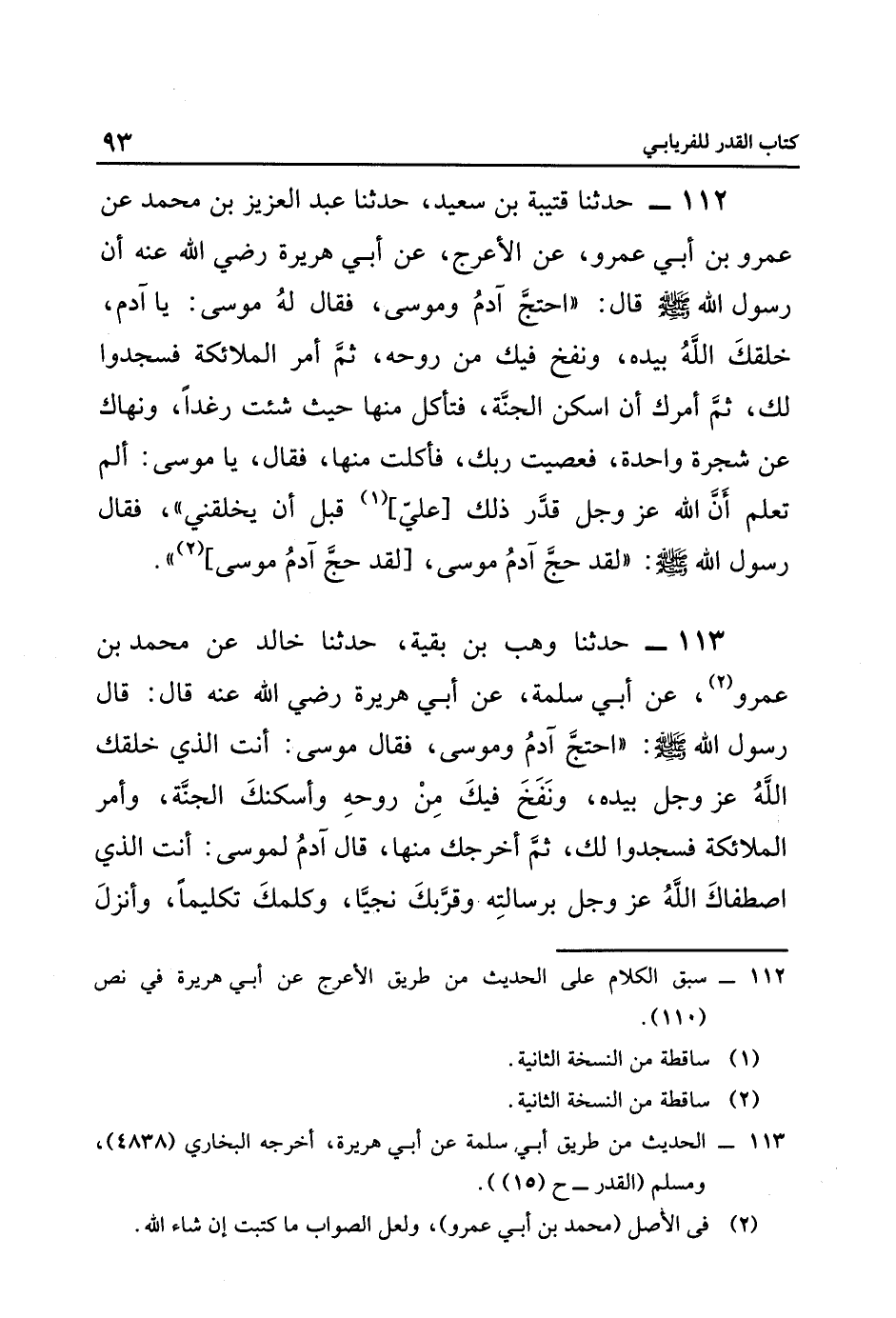 ١١٣- الحديث من طريق أبي سلمة, عن أبي هريرة، أخرجه البخاري: ٤٨٣٨، ومسلم: القدر: ح ١٥.