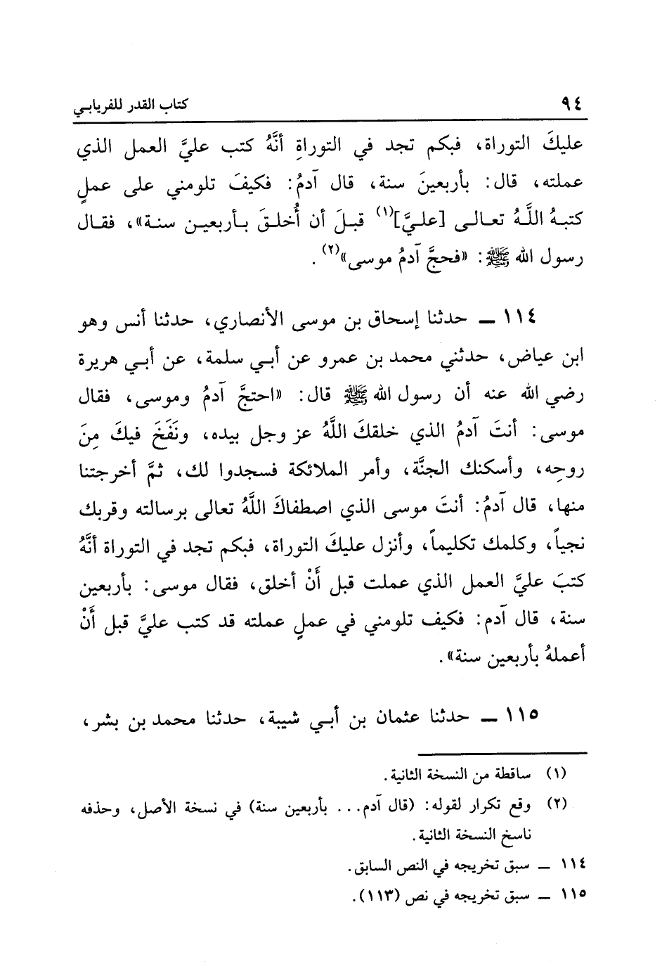 ١١٤ حَدَّثَنَا إِسْحَاقُ بْنُ مُوسَى الْأَنْصَارِيُّ، حَدَّثَنَا أَنَسٌ, وَهُوَ ابْنُ عِيَاضٍ، حَدَّثَنِي مُحَمَّدُ بْنُ عَمْرٍو. \, عَنْ أَبِي سَلَمَةَ، عَنْ أَبِي هُرَيْرَةَ رَضِيَ اللَّهُ عَنْهُ, أَنَّ رَسُولَ اللَّهِ صَلَّى اللهُ عَلَيْهِ وَسَلَّمَ قَالَ: "احْتَجَّ آدَمُ وَمُوسَى، فَقَالَ مُوسَى: أَنْتَ آدَمُ الَّذِي خَلَقَكَ اللَّهُ عَزَّ وَجَلَّ بِيَدِهِ، وَنَفَخَ فِيكَ مِنْ رُوحِهِ، وَأَسْكَنَكَ الْجَنَّةَ، وَأَمَرَ الْمَلَائِكَةَ, فَسَجَدُوا لَكَ، ثُمَّ أَخْرَجْتَنَا مِنْهَا، قَالَ آدَمُ: أَنْتَ مُوسَى الَّذِي اصْطَفَاكَ اللَّهُ تَعَالَى بِرِسَالَتِهِ, وَقَرَّبَكَ نَجِيًّا، وَكَلَّمَكَ تَكْلِيمًا، وَأَنْزَلَ عَلَيْكَ التَّوْرَاةَ، فَبِكَمْ تَجِدُ فِي التَّوْرَاةِ أَنَّهُ كُتِبَ عليَّ العمل الذي علمت قَبْلَ أَنْ أُخْلَقَ؟، فَقَالَ مُوسَى: بِأَرْبَعِينَ سَنَةً، قَالَ آدَمُ: فَكَيْفَ تَلُومُنِي فِي عَمَلٍ عَمِلْتُهُ قَدْ كُتِبَ عَلَيَّ قَبْلَ أَنْ أَعْمَلَهُ بِأَرْبَعِينَ سَنَةً؟ ".