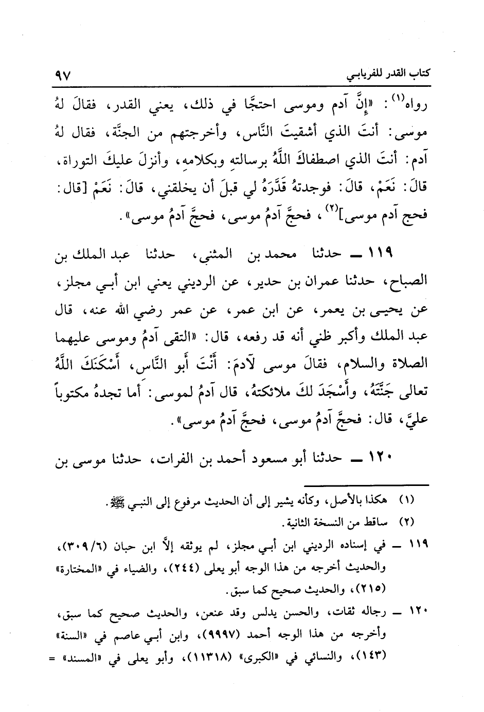 ١١٩ حَدَّثَنَا مُحَمَّدُ بْنُ الْمُثَنَّى، حَدَّثَنَا عَبْدُ الْمَلِكِ بْنُ الصَّبَّاحِ، حَدَّثَنَا عِمْرَانُ بْنُ حُدَيْرٍ، عَنِ الرُّدَيْنِيِّ, يَعْنِي ابْنَ أَبِي مِجْلَزٍ، عَنْ يَحْيَى بْنِ يَعْمُرَ، عَنِ ابْنِ عُمَرَ، عَنْ عُمَرَ رَضِيَ اللَّهُ عَنْهُ، قَالَ عَبْدُ الْمَلِكِ, وَأَكْبَرُ ظَنِّي أَنَّهُ قَدْ رَفَعَهُ، قَالَ: "الْتَقَى آدَمُ وَمُوسَى عَلَيْهِمَا الصَّلَاةُ وَالسَّلَامُ، فَقَالَ مُوسَى لِآدَمَ: أَنْتَ أَبُو النَّاسِ، أَسَكَنَكَ اللَّهُ تَعَالَى جَنَّتَهُ، وَأَسْجَدَ لَكَ مَلَائِكَتَهُ، قَالَ آدَمُ لِمُوسَى: أَمَا تَجِدُهُ مَكْتُوبًا عَلَيَّ، قَالَ: فَحَجَّ آدَمُ مُوسَى، فَحَجَّ آدَمُ مُوسَى".