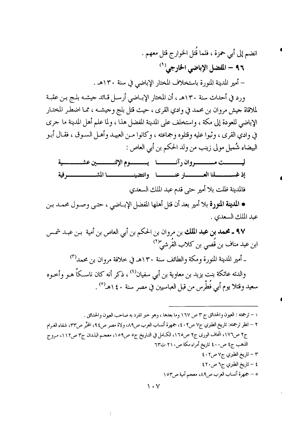 1 - ترجمته: العيون والحدائق ج3 ص167 وما بعدها، وهو خبر انفرد به صاحب العيون والحدائق. 2 - انظر ترجمته: تاريخ الطبري ج7 ص402، جمهرة أنساب العرب ص89، ولاة مصر ص94، المحبَّر ص33، شفاء الغرام ج2 ص176، اتحاف الورى ج2 ص165، الكامل في التاريخ ج5 ص159، معجم البلدان ج3 ص112، مروج الذهب ج4 ص400 تاريخ أمراء مكة ص210 ت63. 3 - تاريخ الطبري ج7 ص402. 4 - تاريخ الطبري ج6 ص420. 5 - جمهرة أنساب العرب ص89، معجم أمية ص153.