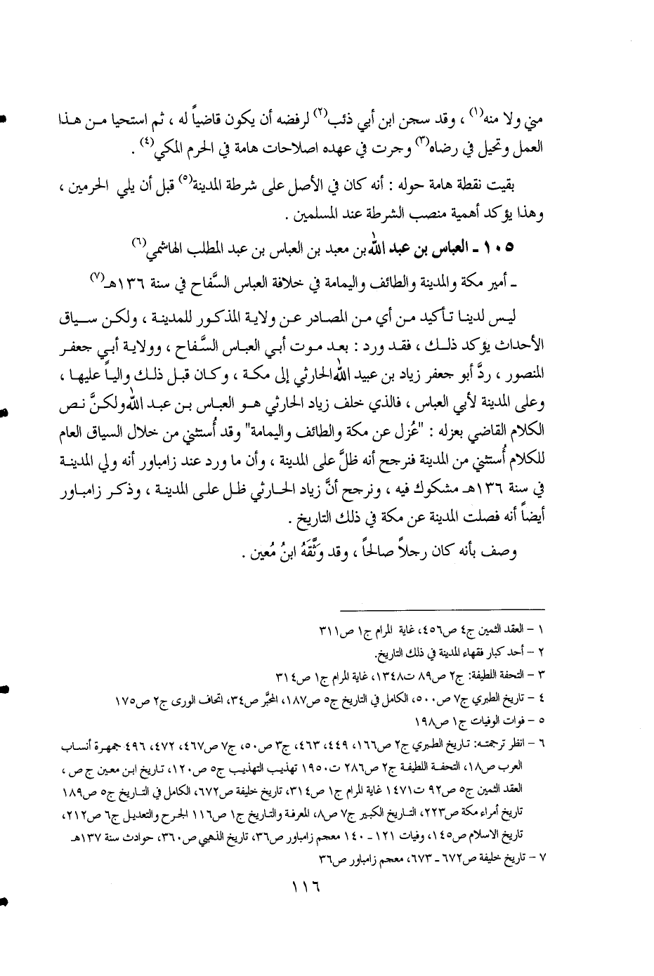 1 - العقد الثمين ج4 ص456، غاية المرام ج1 ص311. 2 - أحد كبار فقهاء المدينة في ذلك التاريخ. 3 - التحفة اللطيفة: ج2 ص89 ت1348، غاية المرام ج1 ص314. 4 - تاريخ الطبري ج7 ص500، الكامل في التاريخ ج5 ص187، المحبَّر ص34، اتحاف الورى ج2 ص175. 5 - فوات الوفيات ج1 ص198. 6 - انظر ترجمته: تاريخ الطبري ج2 ص166، 449، 463، ج3 ص 50، ج7 ص467، 472، 496، جمهرة أنساب العرب ص18، التحفة اللطيفة ج2 ص286، ت1950 تهذيب التهذيب ج5 ص120، تاريخ ابن معين ج ص، العقد الثمين ج5 ص92، ت1471 غاية المرام ج1 ص314، تاريخ خليفة ص672، الكامل في التاريخ ج5 ص189 تاريخ أمراء مكة ص223،التاريخ الكبير ج7 ص8، المعرفة والتاريخ ج1 ص116 الجرح والتعديل ج6 ص212، تاريخ الإسلام ص145، وفيات 121 - 140 معجم زامباور ص36، تاريخ الذهبي ص360، حوادث سنة 137هـ 7 - تاريخ خليفة ص672 - 673، معجم زامباور ص36.