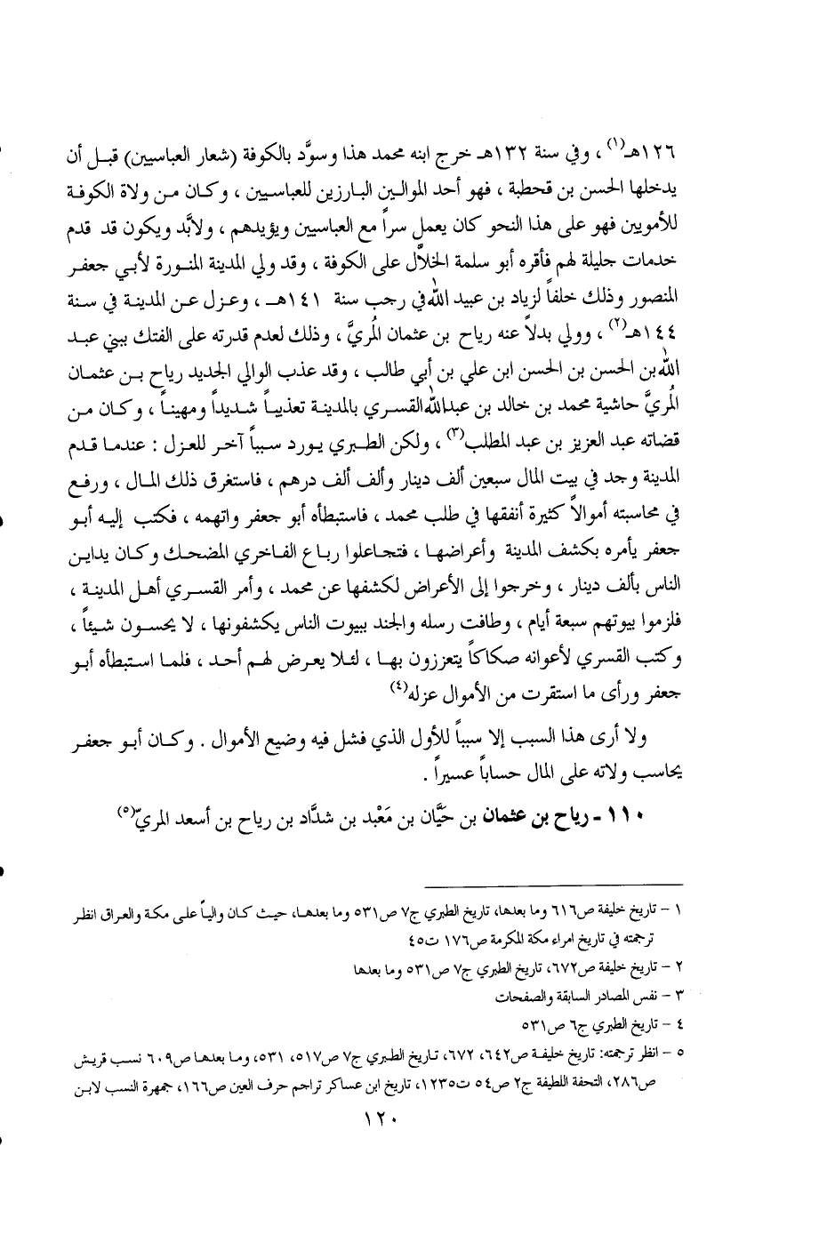 ولا أرى هذا السبب إلا سبباً للأول الذي فشل فيه وضيع الأموال. وكان أبو جعفر يحاسب ولاته على المال حساباً عسيراً. 110 - رياح بن عثمان بن حيان بن معبد بن شداد بن رياح بن أسعد المري (5).