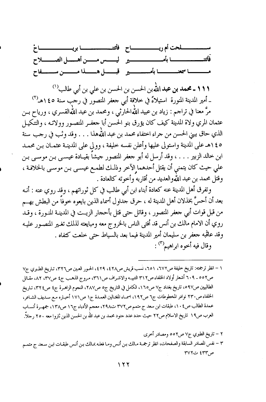 1 - انظر ترجمته: تاريخ خليفة ص672، 651، نسب قريش ص428، 429، الحور العين ص326، تاريخ الطبري ج7 ص552 - 609، أشعار أولاد اخلفاء صس312 التنبيه والإشراف ص361، مروج الذهب ج4ص 37، 82، مقاتل الطالبيين ص597، تاريخ بغداد ج7 ص165، الكامل في التاريخ ج5 ص287، النجوم الزاهرة ج4 ص324، تاريخ الخلفاء ص230 نوادر المخطوطات ج6 ص192، أسماء المغتالين العمدة ج1 ص171، أخباره مع سديف الشاعر، عمدة الطلب ص104، طبقات ابن سعد ج متمم ص372 ت298،معجم الأدباء ج16 ص138، جمهرة أنساب العرب ص19، تاريخ الإسلام ص22 حيث حدد عدد جند محمد بن عبدالله بن الحسن الذين ثاروا معه 250 رجلاً. 2 - تاريخ الطبري ج7 ص552، ومصادر أخرى. 3 - نفس المصادر الاسبقة والصفحات، انظر تجرمة مالك بن أنس وما فعله بمالك بن أنس طبقات ابن سعد ج متمم ص433 ت372.