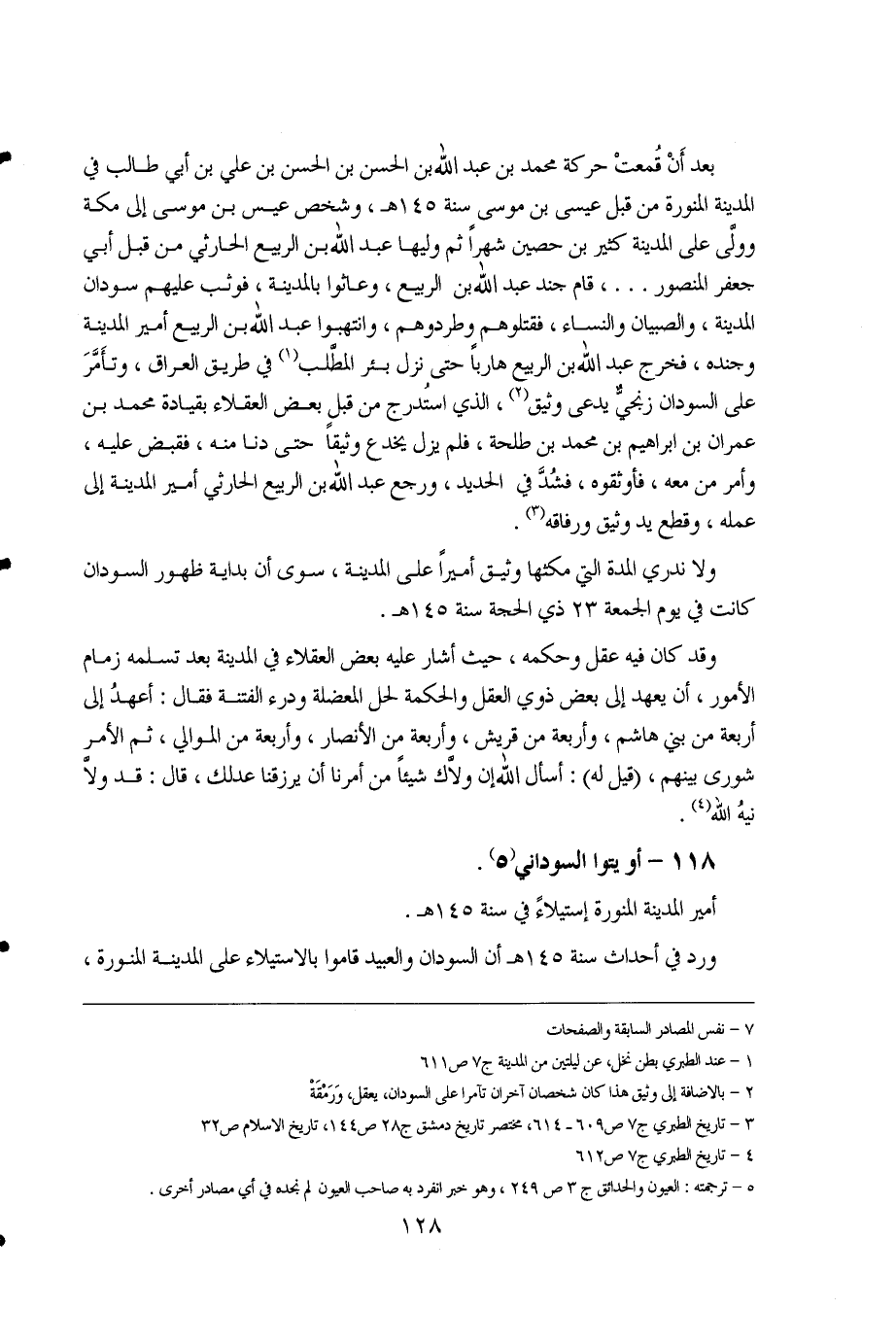7 - نفس المصادر السابقة والصحفات. 1 - عند الطبري بطن نخل، عن ليتين من المدينة ج7 ص611. 2 - بالإضافة إلى وثيق هذا كان شخصان آخران تآرما على السودان، يعقل، ورَمْقَة. 3 - تاريخ الطبري ج7 ص609 - 614، مختصر تاريخ دمشق ج28 ص144، تاريخ الإسلام ص32. 4 - تاريخ الطبري ج7 ص612. 5 - ترجمته: العيون والحدائق ج3 ص249، وهو خبر انفرد به صاحب العيون لم نجده في أي مصادر أخرى.
