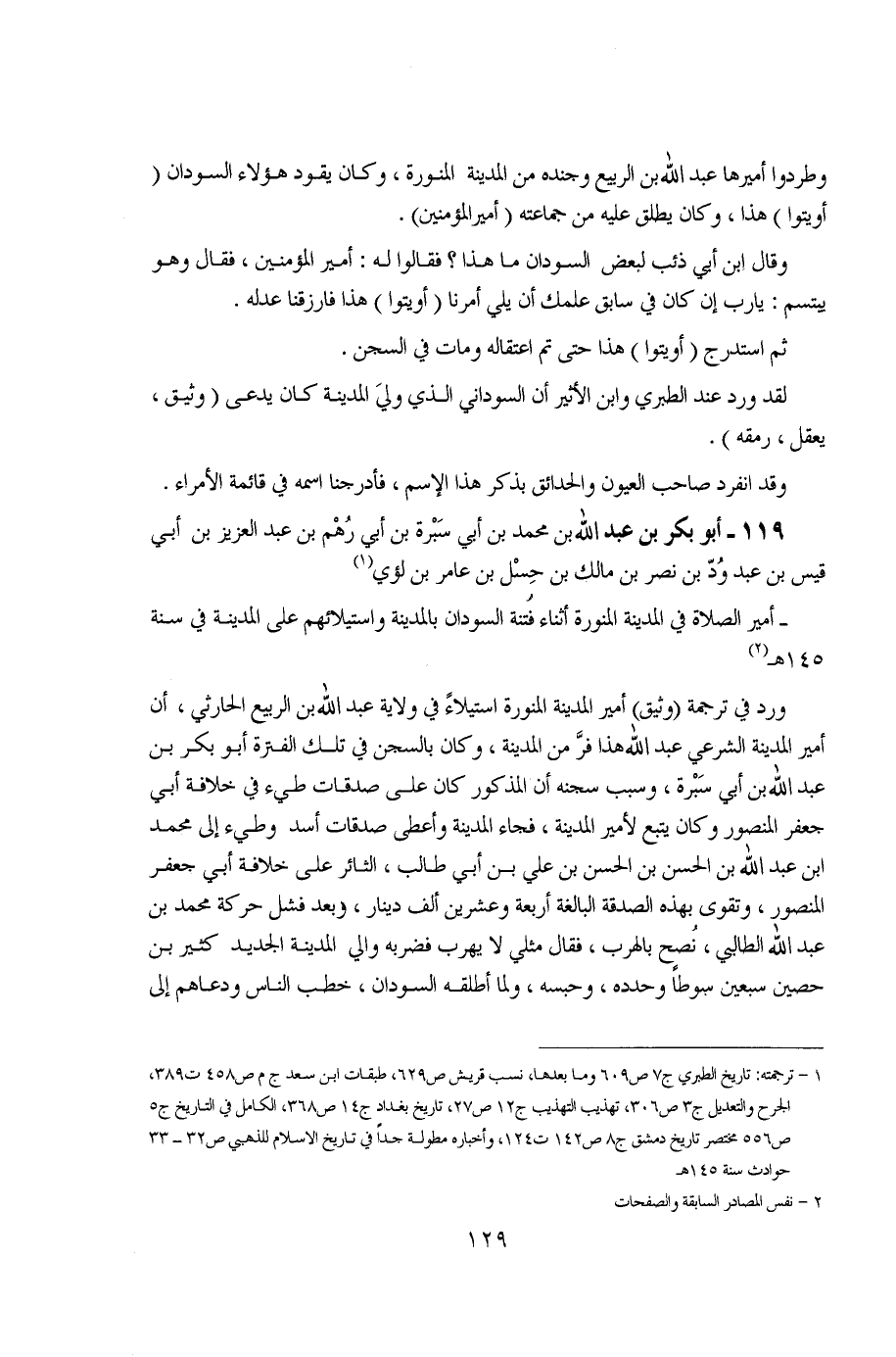 1 - ترجمته: تاريخ الطبري ج7 ص609 وما بعدها، نسب قريش ص629، طبقات ابن سعد ج م ص 458 ت 389، الجرح والتعديل ج3 ص306، تهذيب التهذيب ج12 ص27، تاريخ بغداد ج14 ص38، الكامل في التاريخ ج5 ص556 مختصر تاريخ دمشق ج8 ص142 ت124، وأخباره مطولة جداً في تاريخ الإسلام للذهبي ص32 - 33 حوادث سنة 145هـ.