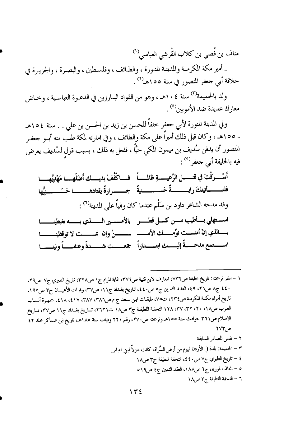 1 - انظر ترجمته: تاريخ خليفة ص732، المعارف لابن قتيبة ص374، غاية المرام ج1 ص328، تاريخ الطبري ج7 ص 29، 440، ج8 ص26، 49، العقد الثمين ج5 ص440، تاريخ بغداد ج11، ص37، وفيات العيان ج3 ص195، تاريخ أمراء مكة المكرمة ص234، ت75، طبقات ابن سعد ج م ص 386، 387، 417، 418، جمهرة أنساب العرب ص18، 20، 32، 37، 128 التحفة الطيفة ج3 ص18 ت 2621، تاريخ بغداد ج11 ص37، تاريخ الإسلام ص361، حوادث سنة 155هـ وترجمته ص270، رقم 221 وفيات سنة 185هـ تاريخ ابن عساكر مجلد 42 ص273. 2 - نفس المصادر السابقة. 3 - الحميمة: بلدة في الأردن اليوم من أرض السرة، كانت منزلاً لبني العباس. 4 - تاريخ الطبري ج7 ص440، التحفة اللطيفة ج3 ص18. 5 - اتحاف الورى ج2 ص188، العقد الثمين ج4 ص519. 6 - التحفة اللطيفة ج3 ص18.