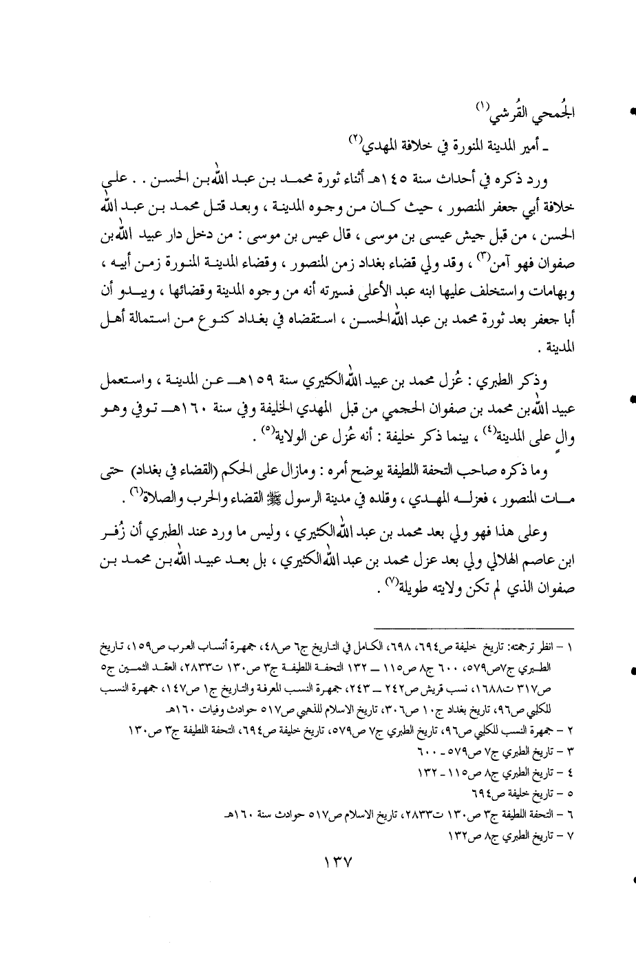 1 - انظر ترجمته: تاريخ خليفة ص694، 698، الكامل في التاريخ ج6 ص48، جمهرة أنساب العرب ص159، تاريخ الطبري ج7 ص579، 600، ج8 ص115 - 132 التحفة اللطيفة ج3 ص130 ت2833، العقد الثمين ج5 ص317، ت1688، نسب قريش ص242 - 243، جمهرة النسب المعرفة والتاريخ ج1 ص147، جمهرة النسب للكلبي ص96، تاريخ بغداد ج10، ص306، تاريخ الإسلام للذهبي ص517 حوادث وفيات 160هـ. 2 - جمهرة النسب للكلبي ص96، تاريخ الطبري ج7 ص579، تاريخ خليفة ص694، التحفة اللطيفة ج3 ص130. 3 - تاريخ الطبري ج7، ص579 - 600. 4 - تاريخ الطبري ج8 ص115 - 132. 5 - تاريخ خليفة ص694. 6 - التحفة اللطيفة، ج3 ص130 ت2833، تاريخ الإسلام ص517، حوادث سنة 160هـ. 7 - تاريخ الطبري ج8 ص132.