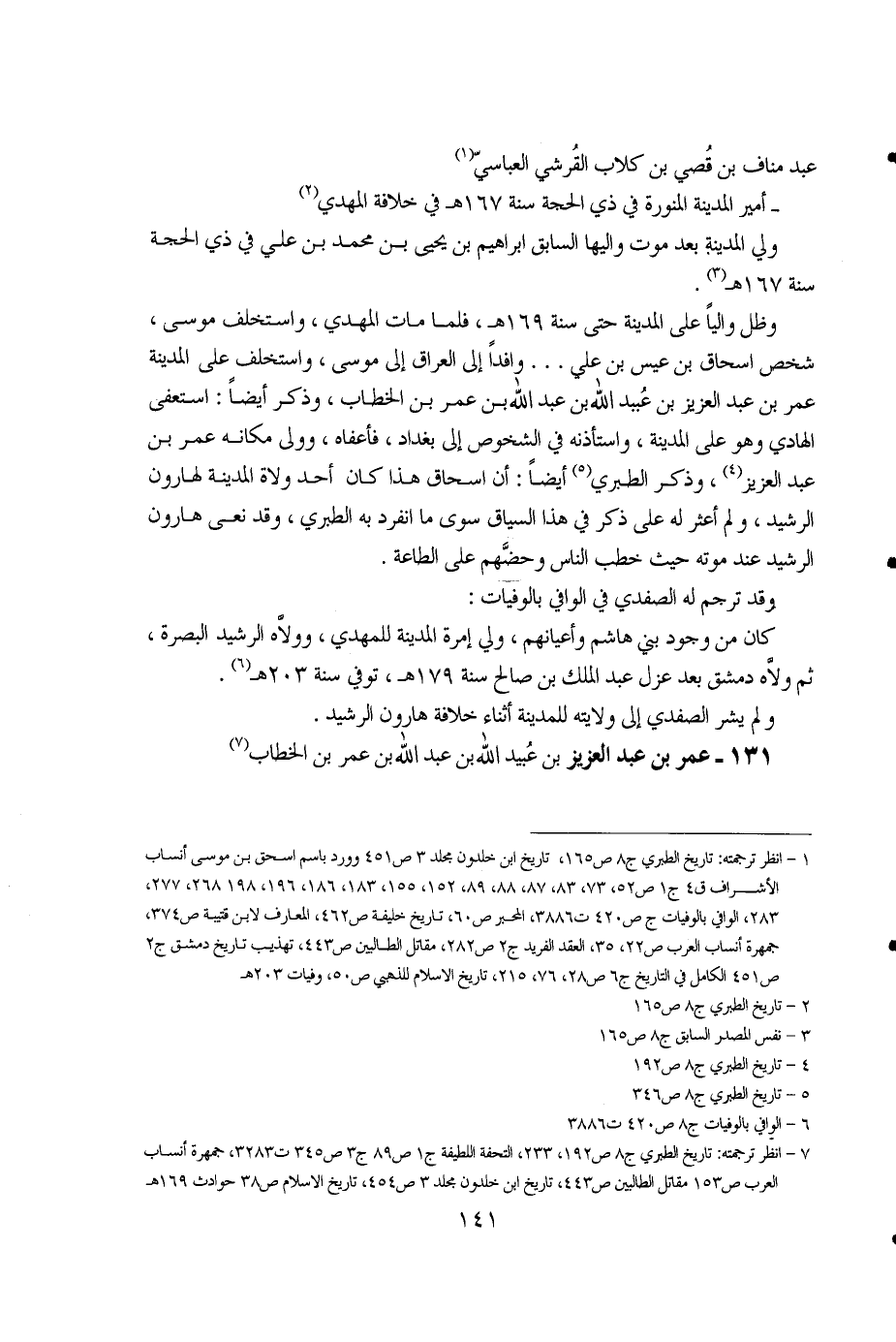 7 - انظر ترجمته: تاريخ الطبري ج8 ص192، 233، التحفة اللطيفة ج1 ص89، ص345، ت 3283 جمهرة أنساب العرب ص153، مقاتل الطالبين ص443، تاريخ ابن خلدون مجلد 3 ص454، تاريخ الإسلام ص38، حوادث 169هـ.