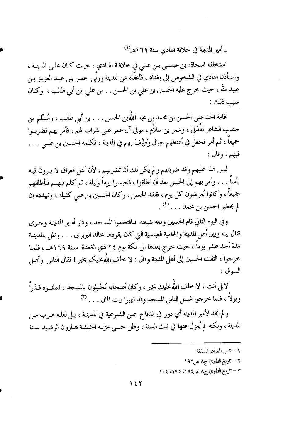 إقامة الحد على الحسن بن محمد بن عبد الله بن الحسن .. بن أبي طالب، ومسلم بن جندب الشاعر الهذلي، وعمر بن سلام، مولى آل عمر على شراب لهم، فأمر بهم فضربوا جميعاً، ثم أمر فجعل في أعناقهم حبال وطيف بهم في المدينة، فكلمه الحسين بن علي .. فيهم، وقال: ليس هذا عليهم وقد ضربتهم ولم يكن لك أن تضربهم، لأن أهل العراق لا يرون فيه بأساً. وأمر بهم إلى الحبس بعد أن أطلقوا، فحبسوا يوماً وليلة، ثم كلم فيهم فأطلقهم جميعاً، وكانوا يعرضون كل يوم، ففقد الحسن، وكان الحسين بن علي كفيله، وتهدده إن لم يحضر الحسن بن محمد .. (2). وفي اليوم التالي قام الحسين ومعه شيعته فاقتحموا المسجد، ودار أمير المدينة وجرى قتال بينه وبين أهل المدينة والحامية العباسية التي كان يقودها خالد البربري .. وظل بالمدينة مدة أحد عشر يوماً، حيث خرج بعدها إلى مكة يوم 24 ذي القعدة سنة 169هـ، فلما خرجوا، التفت الحسين إلى أهل المدينة وقال: