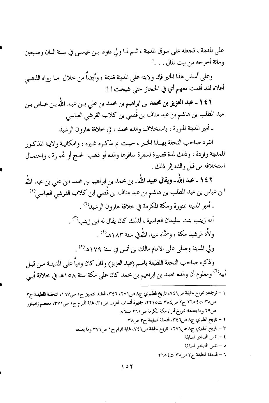 142 - عبد الله - ويقال عبيد الله - بن محمد بن إبراهيم بن محمد بن علي بن عبد الله ابن عباس بن عبد المطلب بن هاشم بن عبد مناف بن قصي ابن كلاب القرشي العباسي (1).