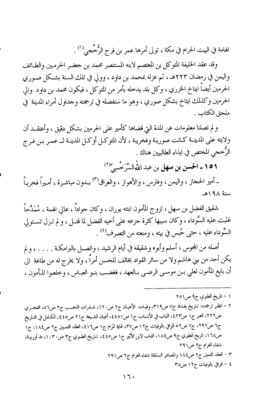 1 - تاريخ الطبري ج9 ص251. 2 - انظر ترجمته: تاريخ بغداد ج7 ص319، وفيات العيان ج2 ص120، شذرات الذهب ج2 ص86، الفخري ص222، العبر ج1 ص423، اللباب في الأنساب ج1 ص4451، اعيان الشيعة ج21 ص445، الكامل في التاريخ ج6 ص297، ج7، ص52، الوافي بالوفيات ج12 ص37، غاية المرام ج1 ص416، العقد الثمين ج2 ص184، ج1 ص168، تاريخ الطبري ج9 ص184، اللباب لابن الأثير ج1 ص445، تاريخ الطبري ج3 ص1030، ط أوربية، شفاء الغرام ج2 ص291. 3 - العقد الثمين ج2 ص184 والمصادر السابقة شفاء الغرام ج2 ص291. 4 - الوافي بالوفيات ج12 ص38.