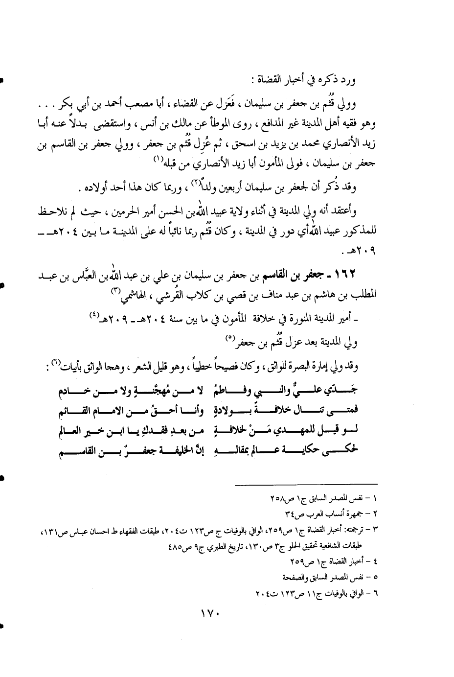 170 ... ورد ذكره في أخبار القضاة: وولي قُثُم بن جعفر بن سليمان، فعزل عن القضاء، أبا مصعب أحمد بن أبي بكر .. وهو فقيه أهل المدينة غير المدافع، روى الموطأ عن مالك بن أنس، واستقضى بدلاً عنه أبا زيد الأنصاري محمد بن يزيد إسحاق، ثم عُزل قثم بن جعفر، وولي جعفر بن القاسم بن جعفر بن سليمان، فولى المأمون أبا زيد الأنصاري من قبله (1). وقد ذكر أن لجعفر بن سليمان أربعين ولداً (2)، وربما كان هذا أحد أولاده. وأعتقد أنه ولي المدينة في أثناء ولاية عبيد الله بن الحسن أمير الحرمين، حيث لم نلاحظ للمذكور عبيد الله أي دور في المدينة، وكان قثم ربما نائباً له على المدينة ما بين 204هـ - 209هـ.
