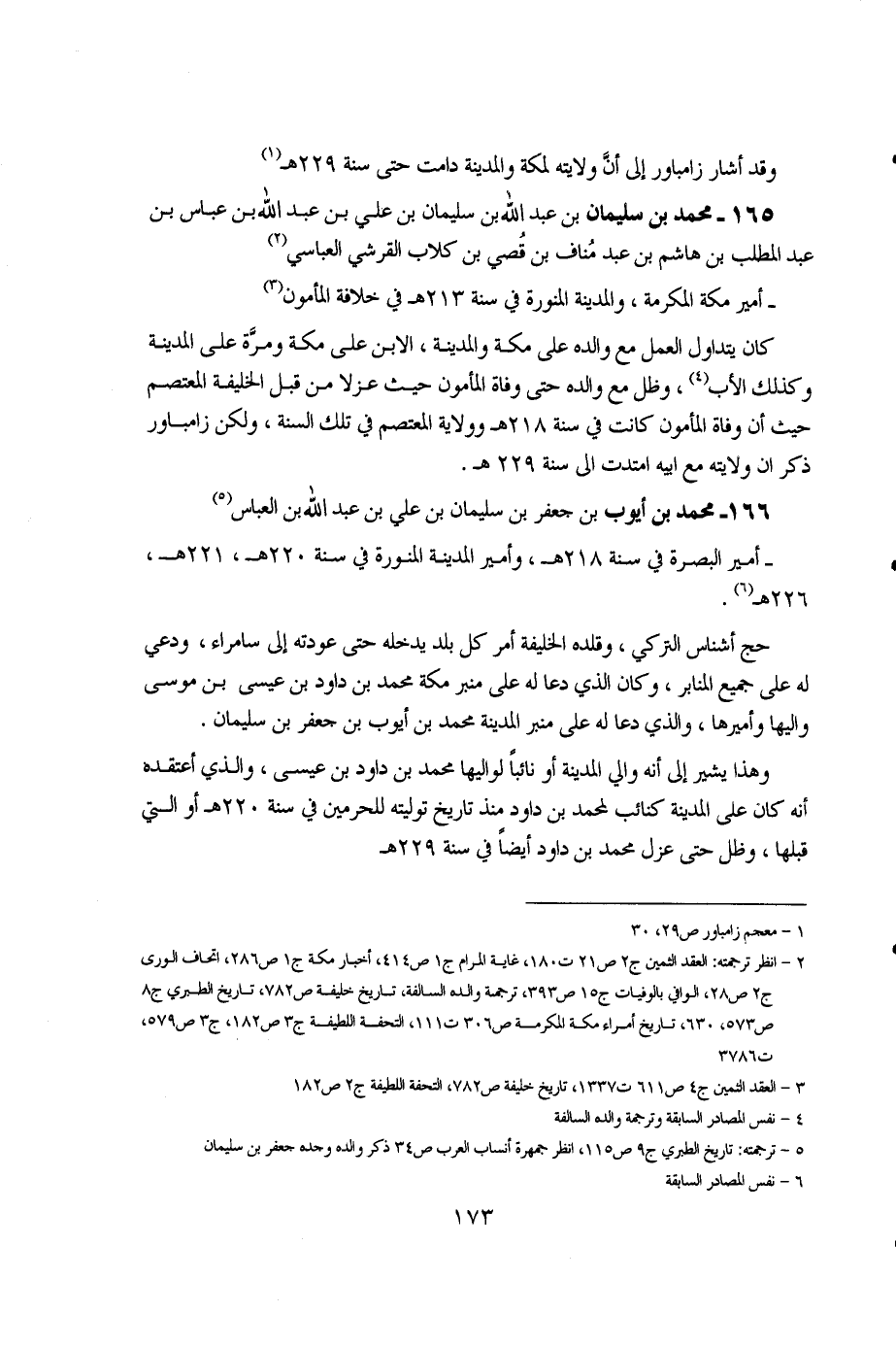 1 - معجم زامباور ص29، 30. 2 - انظر ترجمته: العقد الثمين ج2 ص21 ت180، غاية المرام ج1 ص414، أخبار مكة ج1 ص286، اتحاف الورى ج2 ص28، الوافي بالوفيات ج15 ص393، ترجمة والده السالفة، تاريخ خليفة ص782، تاريخ الطبري ج8 ص573، 630، تاريخ أمراء مكة المكرمة ص306 ت111، التحفة اللطيفة ج3 ص182، ص579، ت3786. 3 - العقد الثمين ج4 ص611 ت1337، تاريخ خليفة ص782، التحفة اللطيفة ج2 ص182. 4 - نفس المصادر السابقة وترجمة والده السالفة. 5 - ترجمته: تاريخ الطبري ج9 ص115، انظر جمهرة أنساب العرب ص34 ذكر والده وجده جعفر بن سليمان. 6 - نفس المصادر السابقة.