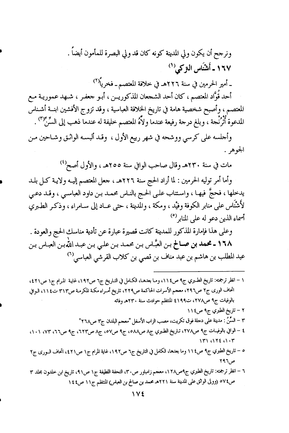 1 - انظر ترجمته: تاريخ الطبري ج9 ص114، وما بعدها، الكامل في التاريخ ج6 ص192، غاية المرام ج1 ص421، اتحاف الورى ج2 ص296، معجم الأسرات الحاكمة ص229، تاريخ أمراء مكة المكرمة ص313، ت114، الوافي بالوفيات ج9 ص278، ت4199، المنتظم حوادث سنة 230هـ وفاته. 2 - تاريخ الطبري ج9 ص114. 3 - السِّنُ: مدينة على دجلة فوق تكريت، مصب الزاب الأسفل "معجم البلدان ج3 ص268". 4 - الوافي بالوفيات ج9 ص278، تاريخ الطبري ج8 ص588، ج9 ص57، ج8 ص623، ج9 ص66، 73، 101، 103، 124، 131. 5 - تاريخ الطبري ج9 ص114، وما بعدها، الكامل في التاريخ ج6 ص192، غاية المرام ج1 ص421، اتحاف الورى ج2 ص296. 6 - انظر ترجمته: تاريخ الطبري ج9 ص128، معجم زامباور ص30، التحفة اللطيفة ج1 ص91، تاريخ ابن خلدون مجلد 3 ص574 (وولى الواثق على المدينة سنة 221هـ محمد بن صالح بن العباس) المنتظم ج11 ص144.