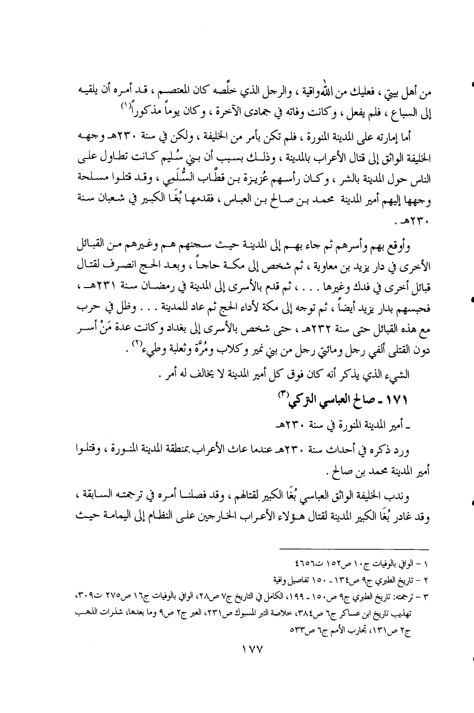 177 ... من أهل بيتي، فعليك من الله واقية، والرجل الذي خلصه كان المعتصم، قد أمره أن يلقيه إلى السباع، فلم يفعل، وكانت وفاته في جمادى الآخرة، وكان يوماً مذكوراً (1). أما إمارته على المدينة المنورة، فلم تكن بأمر من الخليفة، ولكن في سنة 230هـ وجهه الخليفة الواثق إلى قتال الأعراب بالمدينة، وذلك بسبب أن بني سُليم كانت تطاول على الناس حول المدينة بالشر، وكان رأسهم عُزيزة بن قطاب السلمي، وقد قتلوا مسلحة وجهها إليهم أمير المدينة محمد بن صالح بن العباس، فقدمها بُغا الكبير في شعبان سنة 230هـ. وأوقع بهم وأسرهم ثم جاء بهم إلى المدينة حيث سجنهم هم وغيرهم من القبائل الأخرى في دار يزيد بن معاوية، ثم شخص إلى مكة حاجاً، وبعد الحج انصرف لقتال قبائل أخرى في فدك وغيرها .. ، ثم قدم بالأٍسرى إلى المدينة في رمضان سنة 231هـ، فحبسهم بدار يزيد أيضاً، ثم توجه إلى مكة لأداء الحج ثم عاد للمدينة .. وظل في حرب مع هذه القبائل حتى سنة 232هـ، حتى شخص بالأسرى إلى بغداد وكانت عدة من أسر دون القتل ألفي رجل ومائتي رجل من بني نمير وكلاب ومُرَّة وثعلبة وطيء (2). الشيء الذي يذكر أنه كان فوق كل أمير المدينة لا يخالف له أمر.