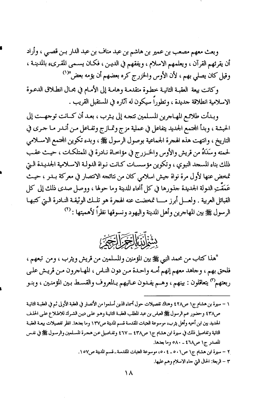 "هذا كتاب من محمد النبي صلى الله عليه وسلم بين المؤمنين والمسلمين من قريش ويثرب، ومن تبعهم، فلحق بهم، وجاهد معهم إنهم أمة واحدة من دون الناس، المهاجرون من قريش على ربعتهم (3) يتعاقلون: بينهم، وهم يفدون عانيهم بالمعروف والقسط بين المؤمنين، وبنو