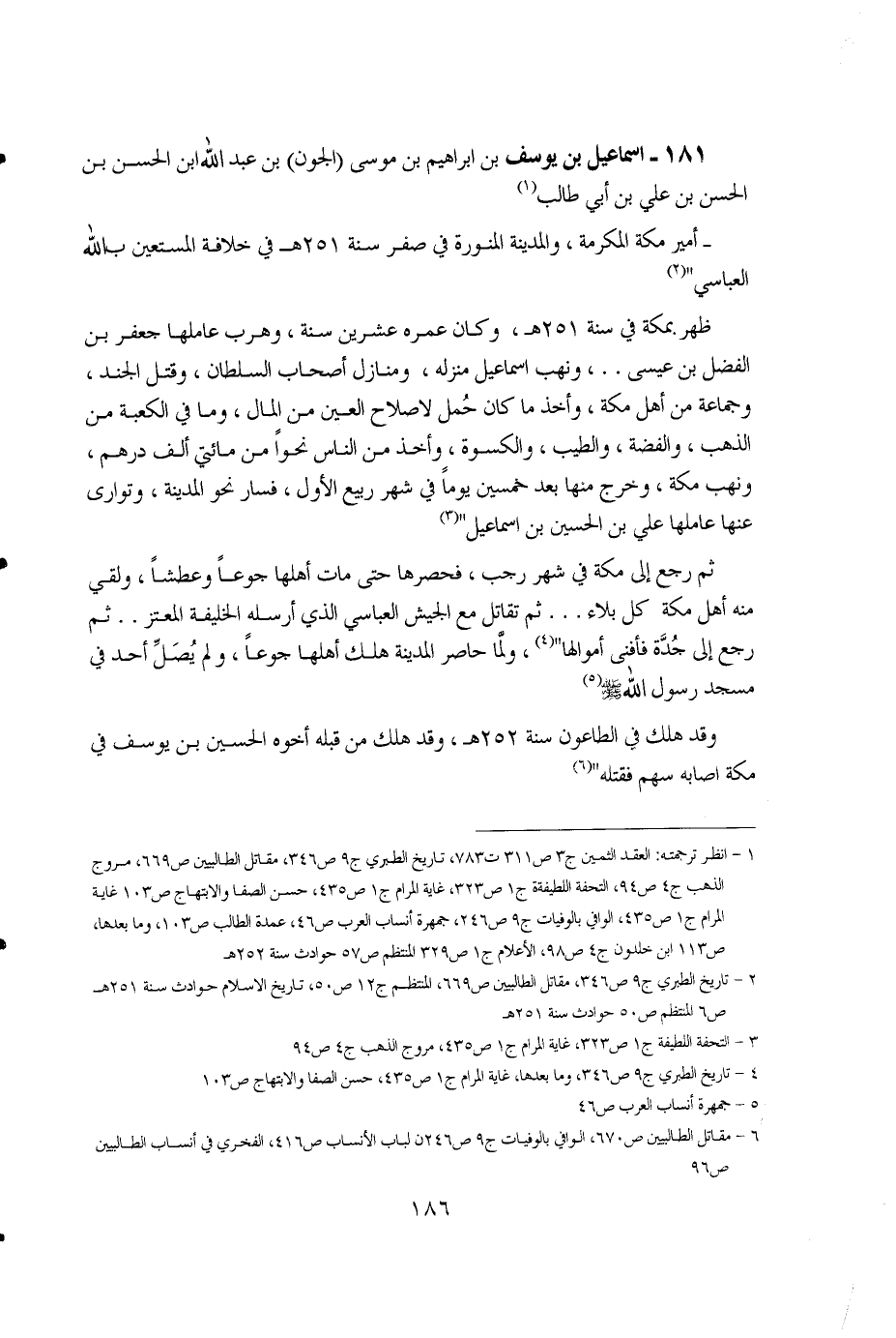 181 - إسماعيل بن يوسف بن إبراهيم بن موسى (الجون) بن عبد الله بن الحسن بن الحسن بن علي بن أبي طالب (1).
