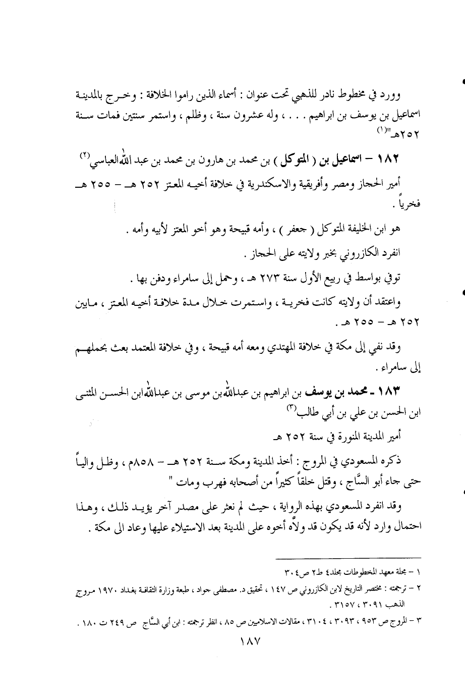 187 ... وورد في مخطوط نادر للذهبي تحت عنوان: أسماء الذين راموا الخلافة: وخرج بالمدينة إسماعيل بن يوسف بن إبراهيم .. ، وله عشرون سنة، وظلم، واستمر سنتين فمات سنة 252هـ" (1).