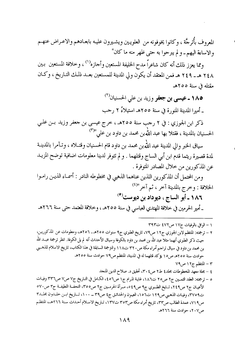1 - الوافي بالوفيات ج17 ص472 ت393. 2 - ترجمته: المنتظم لابن الحوزي ج12 ص79، تاريخ الطبري ج9 سنوات 255هـ - 256هـ، ومعلومات عن المذكورين، حيث ذكر الطبري أنهما مثلا عبدالله بن محمد بن داود بالكوفة وسياق الأحداث أنه لم يل الكوفة، انظر ترجمة عبدالله بن محمد بن داود في سياق تراجم أرماء مكة ص320 ت118 والترجمة السابقة في هذا الكتاب، تاريخ الإسلام للذهبي حوادث سنة 255هـ ص15 يؤكد قتلهما له في المدينة، المنتظم ص79 حوادث سنة 255هـ. 3 - المنتظم ج12 ص79. 4 - مجلة معهد المخطوطات مجلد 4 ط2 ص304، تحقيق د. صلاح الدين المنحد. 5 - ترجمته: العقد الثمين ج2 ص25 ت186، غاية المرام ج1 ص456، الكامل في التاريخ ج7 ص7 ص336 وفيات العيان ج2 ص249، تاريخ الطبري ج9 ص549، مرآة الحرمين ج2 ص355، التحفة اللطيفة ج3 ص570 ت3759، وفيات الذهبي ص129، ت156، العيون والحدائق ج4 ص39 - 100 تاريخ ابن خلدون مجلد 3 ص719، عمدة الطالب ص33، تاريخ أمراء مكة ص353 ت137، تاريخ الإسلام أحداث سنة 266هـ المنتظم ص207، حوادث سنة 266هـ.