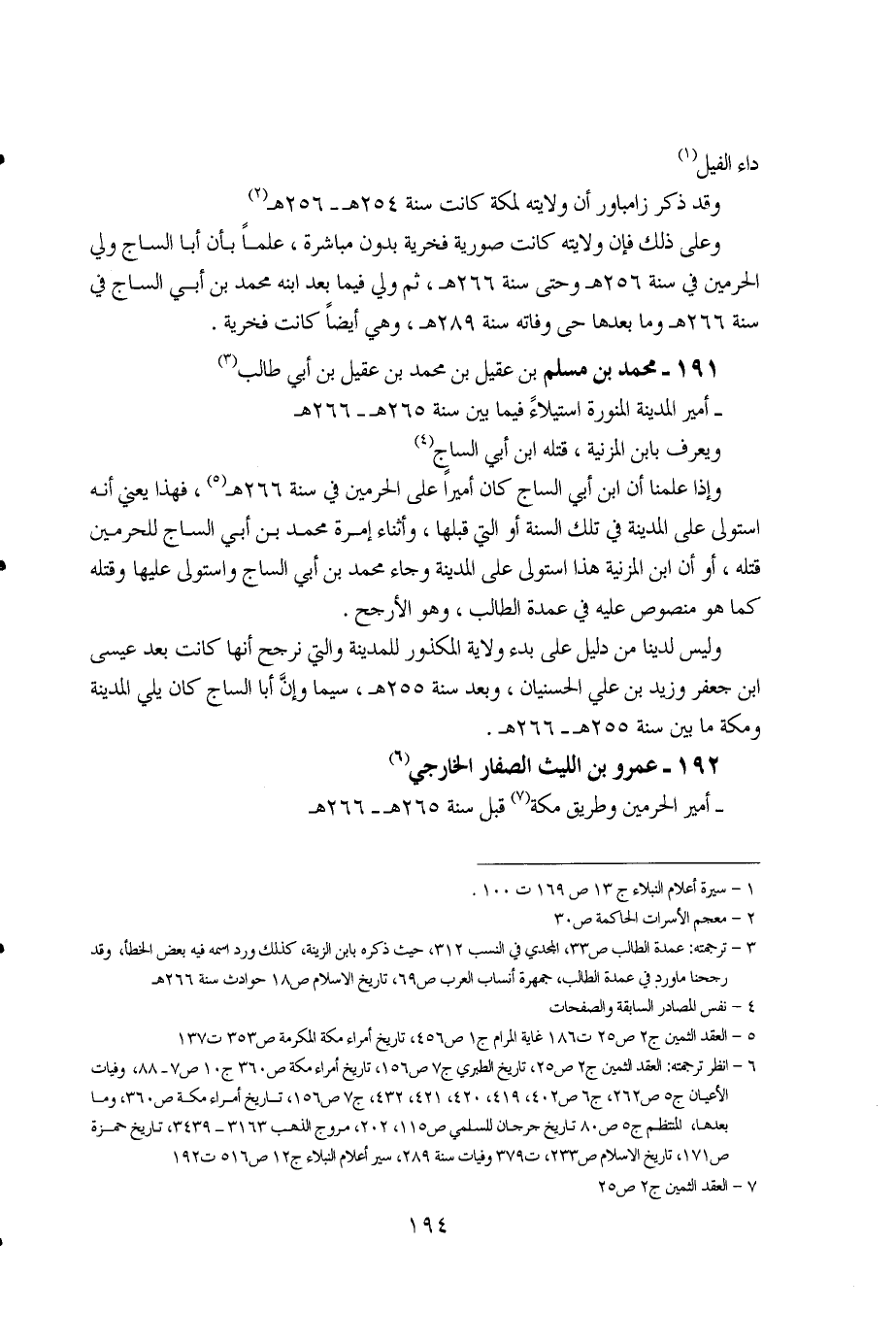 وعلى ذلك فإن ولايته كانت صورية فخرية بدون مباشرة، علماً بأن أبا الساج ولي الحرمين في سنة 256هـ وحتى سنة 266هـ، ثم ولي فيما بعد ابنه محمد بن أبي الساج في سنة 266هـ وما بعدها حتى وفاته سنة 289هـ، وهي أيضاً كانت فخرية. 191 - محمد بن مسلم بن عقيل بن محمد بن عقيل بن أبي طالب (3).