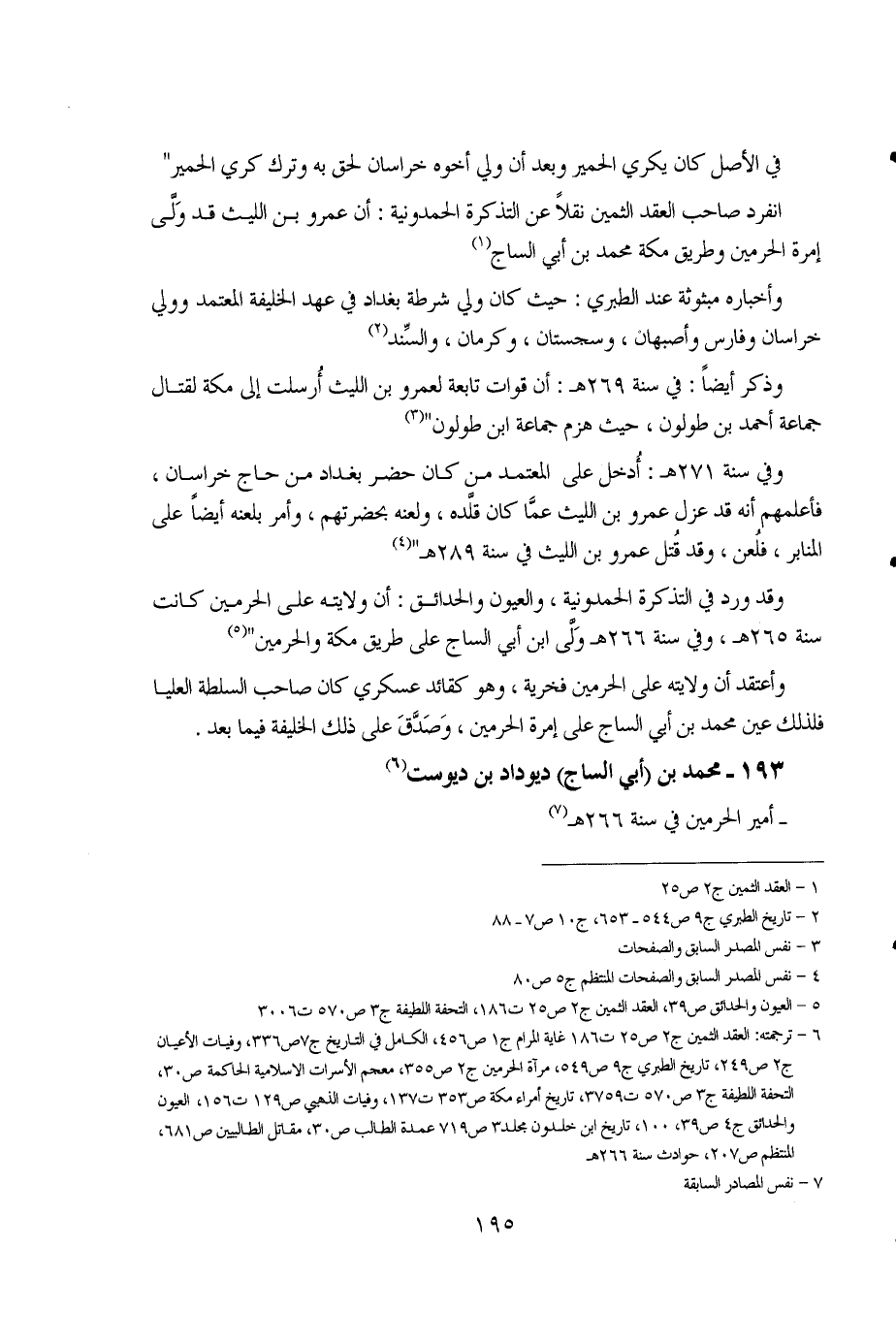 195 ... في الأصل كان يكري الحمير وبعد أن ولي أخوه خراسان لحق به وترك كري الحمير" انفرد صاحب العقد الثمين نقلاً عن التذكرة الحمدونية: أن عمرو بن الليث قد ولى إمرة الحرمين وطريق مكة محمد بن أبي الساج (1). وأخباره مبثوثة عند الطبري: حيث كان ولي شرطة بغداد في عهد الخليفة المعتمد وولي خراسان وفارس وأصبهان، وسجستان، وكرمان، والسند (2).