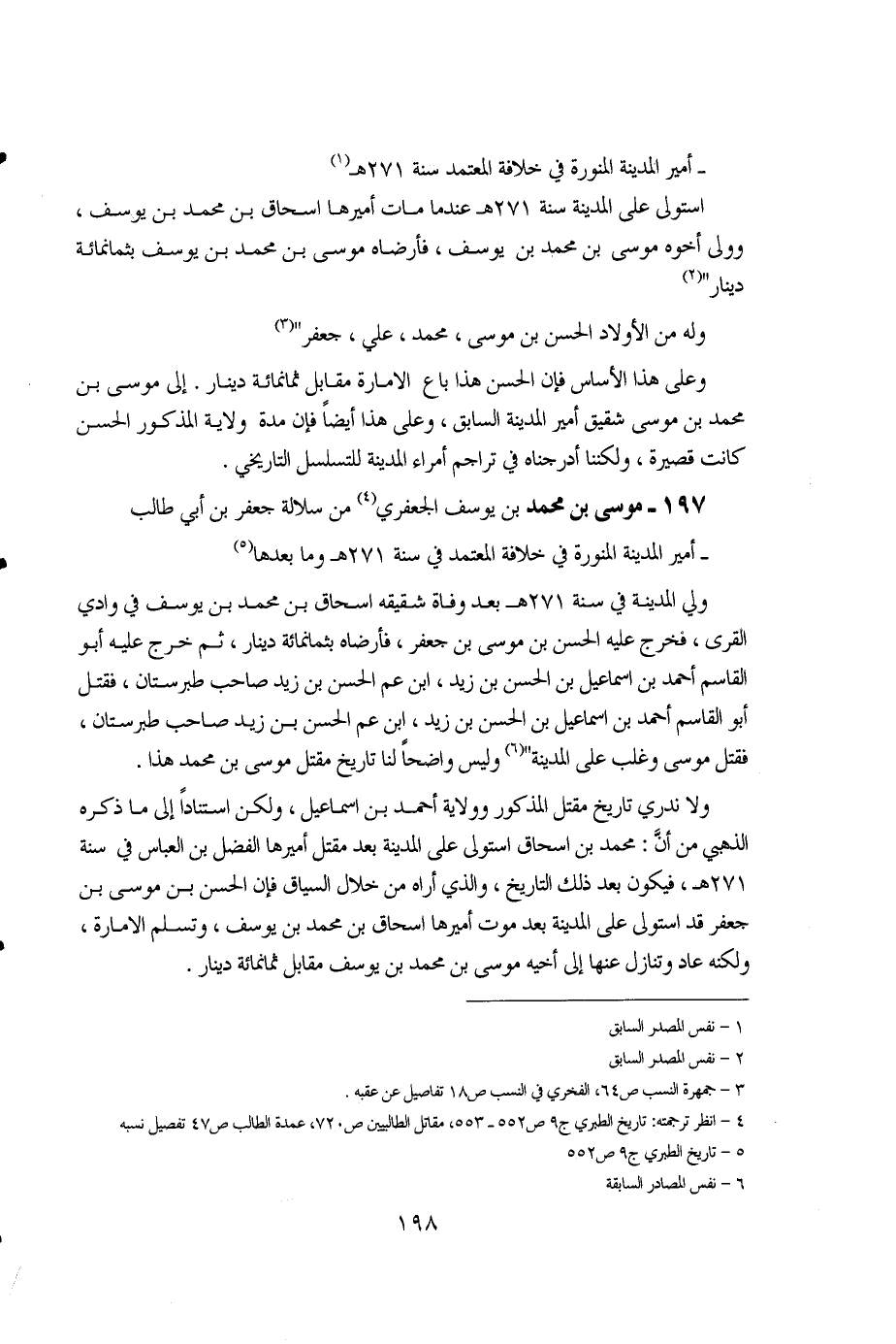 وعلى هذا الأساس فإن الحسن هذا باع الإمارة مقابل ثمانمائة دينار. إلى موسى بن محمد بن موسى شقيق أمير المدينة السابق، وعلى هذا أيضاً فإن مدة ولاية المذكور الحسن كانت قصيرة، ولكننا أدرجناه في تراجم أمراء المدينة للتسلسل التاريخي. 197 - موسى بن محمد بن يوسف الجعفري (4) من سلالة جعفر بن أبي طالب