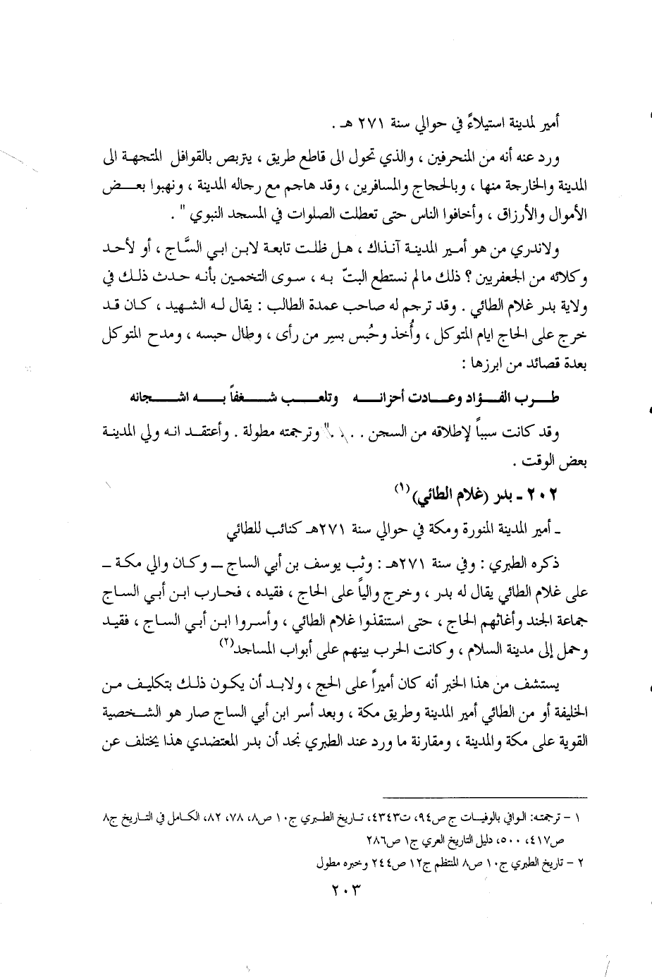 1 - ترجمته: الوافي بالوفيات ج ص 94، ت4343، تاريخ الطبري ج10 ص8، 78، 82، الكامل في التاريخ ج8، ص417، 500، دليل التاريخ العري ج1، ص286. 2 - تاريخ الطبري ج10، ص8، المنتظم ج12، ص244، وخبره مطول.