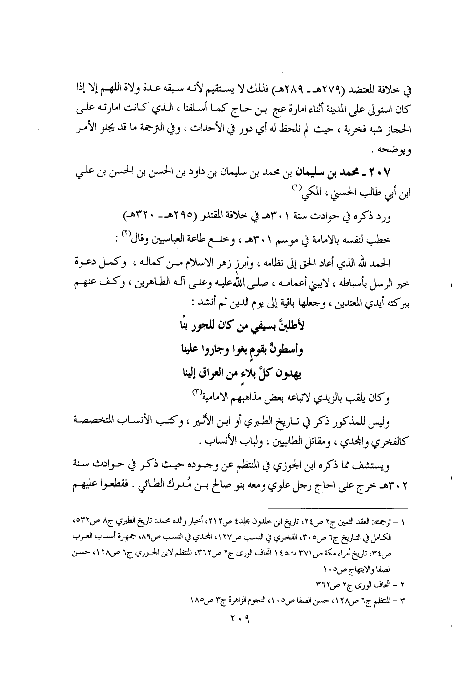 209 ... في خلافة المعتضد (279هـ - 289هـ) فذلك لا يستقيم لأنه سبقه عدة ولاة اللهم إلا إذا كان استولى على المدينة أثناء إمارة عج بن حاج كما أسلفنا، الذي كانت إمارته على الحجاز شبه فخرية، حيث لم نلحظ له أي دور في الأحداث، وفي الترجمة ما قد يجلو الأمر ويوضحه.