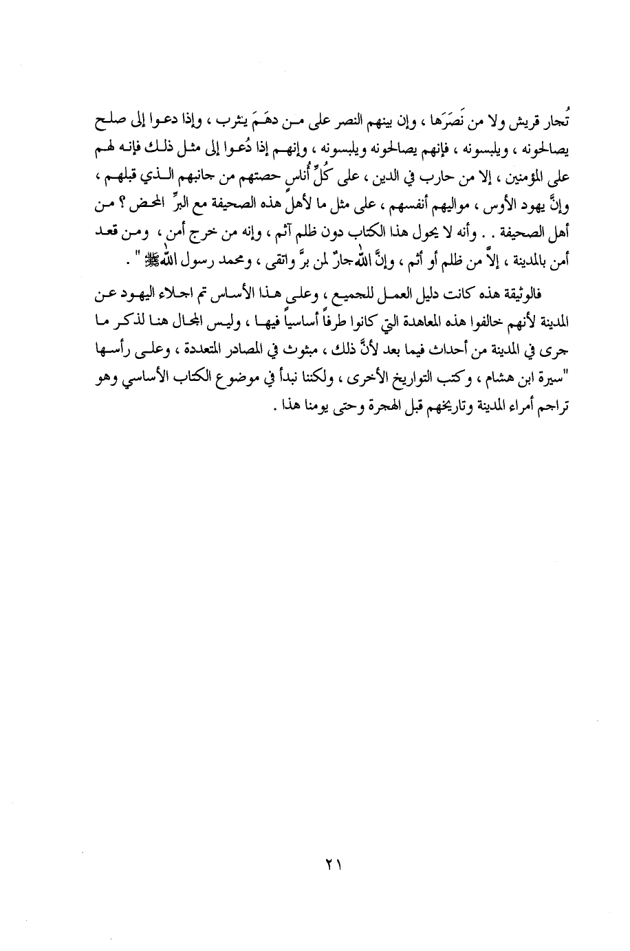 تُجار قريش ولا من نَصَرَها، وإن بينهم النصر على من دهمَ يثرب، وإذا دعوا إلى الصلح يصالحونه، ويلبسونه، فإنهم يصالحونه ويلبسونه، وإنهم إذا دُعوا إلى مثل ذلك فإنه لهم على المؤمنين، إلا من حارب في الدين، على كُلِّ أُناسٍ حصتهم من جانبهم الذي قبلهم، وإنَّ يهود الأوس، مواليهم أنفسهم، على مثل ما لأهل هذه الصحيفة مع البرِّ المحض؟ من أهل الصحيفة .. وأنه لا يحول هذا الكتاب دون ظلم آثم، وإنه من خرج أمن، ومن قعد أمن بالمدينة، إلاَّ من ظلم أو أثم، وإنَّ الله جارٌ لمن برَّ واتقى، ومحمد رسول الله صلى الله عليه وسلم".