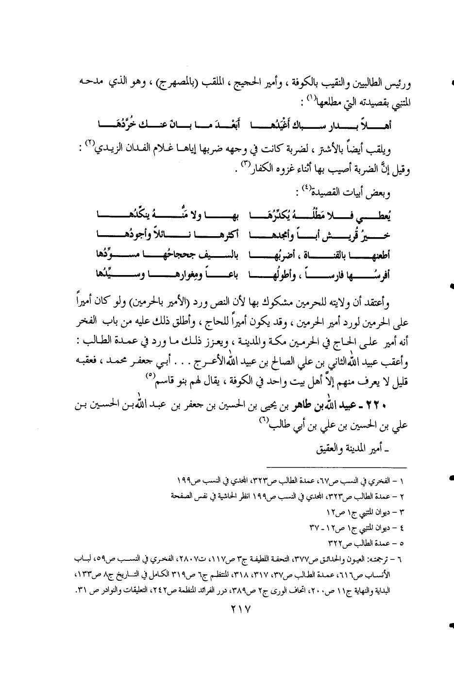217 ... ورئيس الطالبيين والنقيب بالكوفة، وأمير الحجيج، الملقب (بالمصهرج)، وهو الذي مدحه المتنبي بقصيدته التي مطلعها (1):